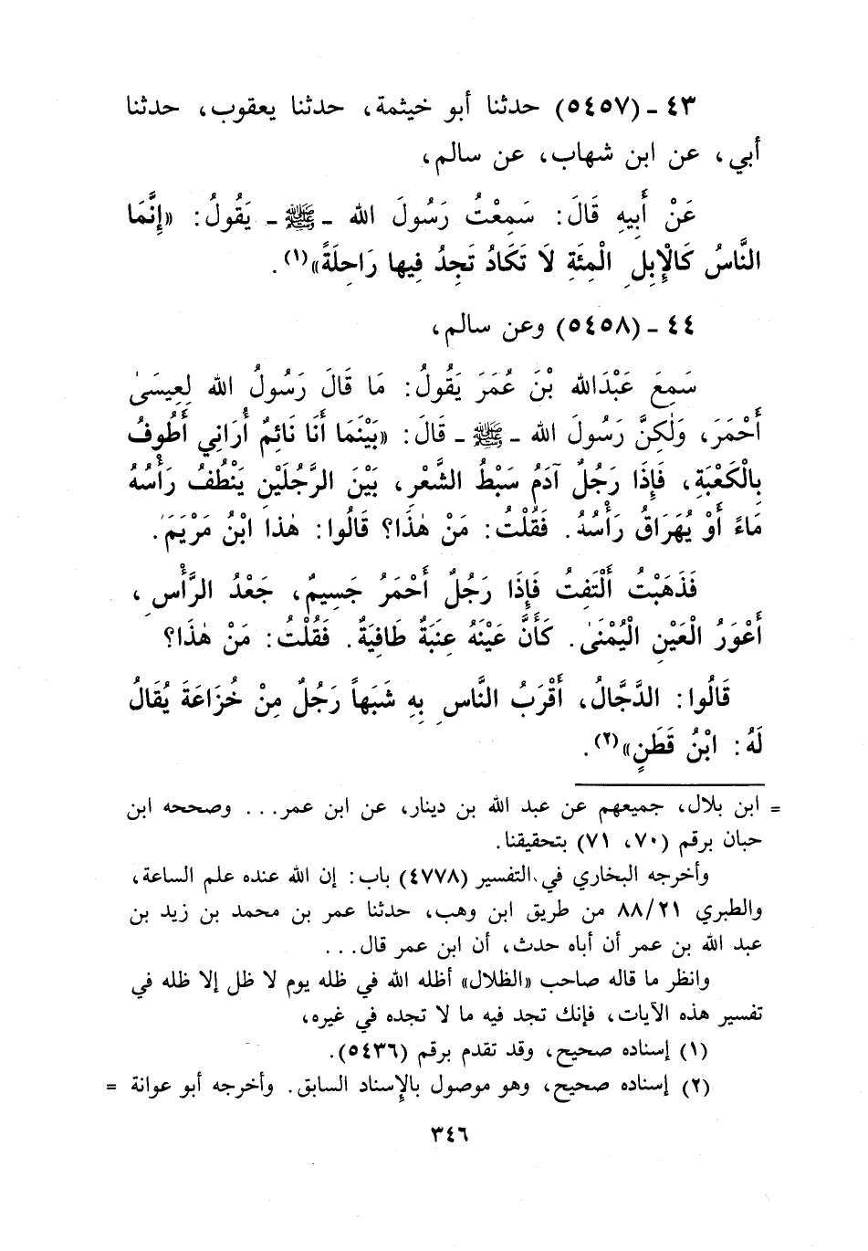 5457 - حَدَّثَنَا أَبُو خَيْثَمَةَ، حَدَّثَنَا يَعْقُوبُ، حَدَّثَنَا أَبِي، عَنِ ابْنِ شِهَابٍ، عَنْ سَالِمٍ، عَنْ أَبِيهِ قَالَ: سَمِعْتُ رَسُولَ اللَّهِ صَلَّى اللهُ عَلَيْهِ وَسَلَّمَ يَقُولُ: «إِنَّمَا §النَّاسُ كَالْإِبِلِ الْمِائَةِ لَا تَكَادُ تَجِدُ فِيهَا رَاحِلَةً» Kإسناده صحيح