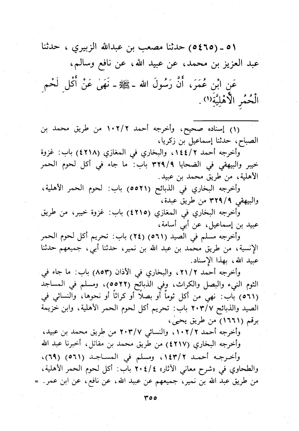 5465 - حَدَّثَنَا مُصْعَبُ بْنُ عَبْدِ اللَّهِ الزُّبَيْرِيُّ، حَدَّثَنَا عَبْدُ الْعَزِيزِ بْنُ مُحَمَّدٍ، عَنْ عُبَيْدِ اللَّهِ، عَنْ نَافِعٍ، وَسَالِمٍ، عَنِ ابْنِ عُمَرَ، «أَنَّ رَسُولَ اللَّهِ صَلَّى اللهُ عَلَيْهِ وَسَلَّمَ §نَهَى عَنْ أَكَلِ لَحْمِ الْحُمُرِ الْأَهْلِيَّةِ» Kإسناده صحيح