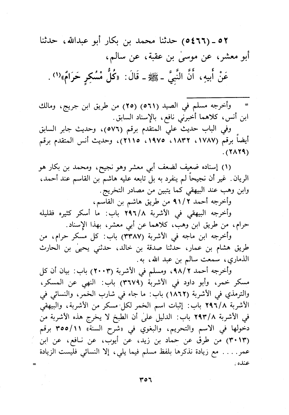5466 - حَدَّثَنَا مُحَمَّدُ بْنُ بَكَّارٍ أَبُو عَبْدِ اللَّهِ، حَدَّثَنَا أَبُو مَعْشَرٍ، عَنْ مُوسَى بْنِ عُقْبَةَ، عَنْ سَالِمٍ، عَنْ أَبِيهِ، أَنَّ النَّبِيَّ صَلَّى اللهُ عَلَيْهِ وَسَلَّمَ قَالَ: «§كُلُّ مُسْكِرٍ حَرَامٌ» Kإسناده ضعيف