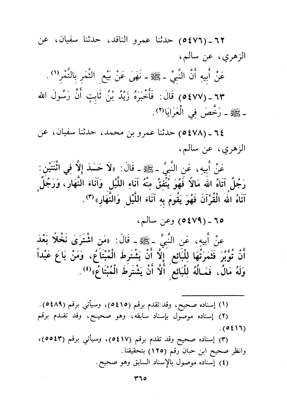 5478 - حَدَّثَنَا عَمْرُو بْنُ مُحَمَّدٍ، حَدَّثَنَا سُفْيَانُ، عَنِ الزُّهْرِيِّ، عَنْ سَالِمٍ، عَنْ أَبِيهِ، عَنِ النَّبِيِّ صَلَّى اللهُ عَلَيْهِ وَسَلَّمَ قَالَ: " §لَا حَسَدَ إِلَّا فِي اثْنَتَيْنِ: رَجُلٌ آتَاهُ اللَّهُ مَالًا فَهُوَ يُنْفِقُ مِنْهُ آنَاءَ اللَّيْلِ وَآنَاءَ النَّهَارِ، وَرَجُلٌ آتَاهُ اللَّهُ الْقُرْآنَ فَهُوَ يَقُومُ بِهِ آنَاءَ اللَّيْلِ وَالنَّهَارِ "Kإسناده صحيح