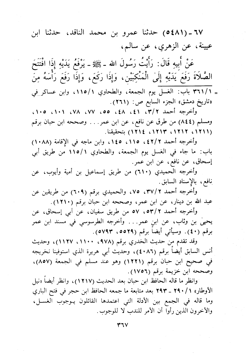 5481 - حَدَّثَنَا عَمْرُو بْنُ مُحَمَّدٍ النَّاقِدُ، حَدَّثَنَا ابْنُ عُيَيْنَةَ، عَنِ الزُّهْرِيِّ، عَنْ سَالِمٍ، عَنْ أَبِيهِ قَالَ: «رَأَيْتُ رَسُولَ اللَّهِ صَلَّى اللهُ عَلَيْهِ وَسَلَّمَ §يَرْفَعُ يَدَيْهِ إِذَا افْتَتَحَ الصَّلَاةَ رَفَعَ يَدَيْهِ إِلَى الْمَنْكِبَيْنِ، وَإِذَا رَكَعَ، وَإِذَا رَفَعَ رَأْسَهُ مِنَ الرُّكُوعِ، وَلَا يَرْفَعُ بَيْنَ السَّجْدَتَيْنِ» Kإسناده صحيح