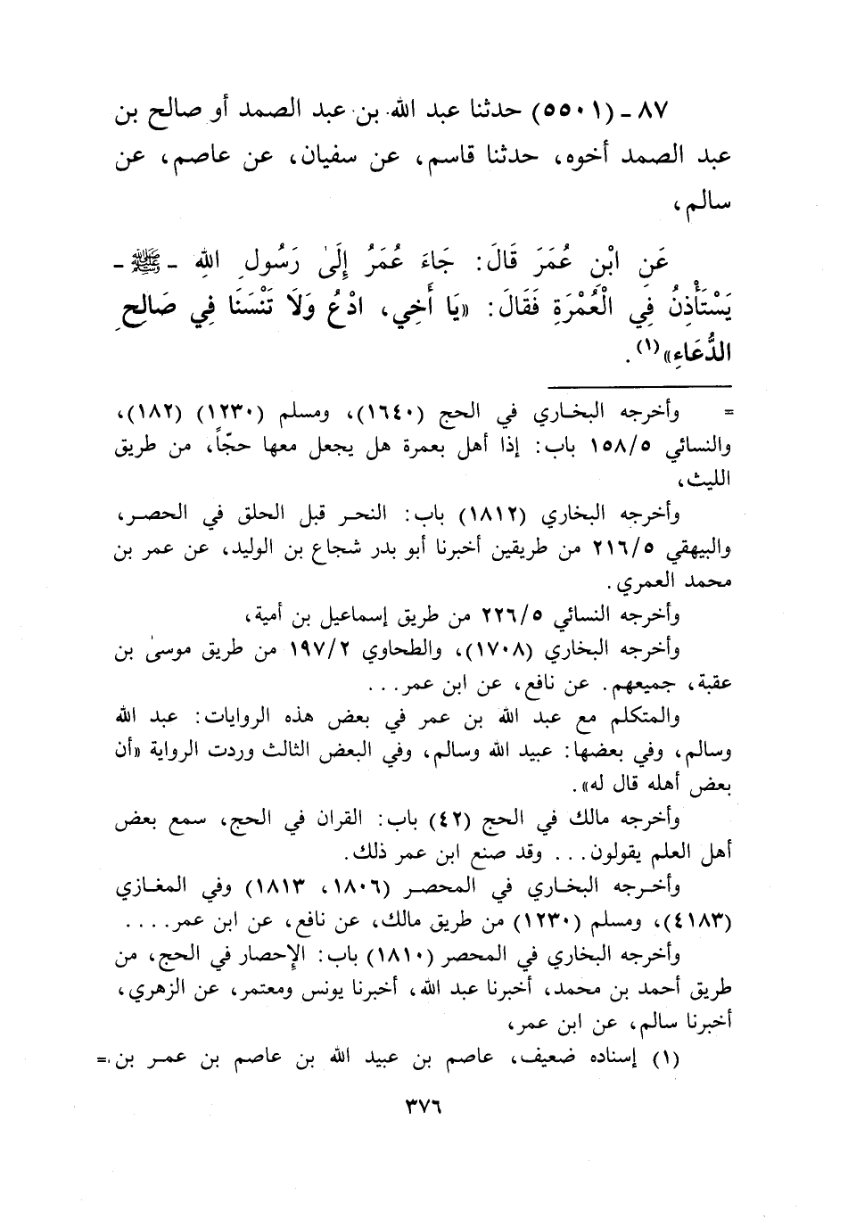 5501 - حَدَّثَنَا عَبْدُ اللَّهِ بْنُ عَبْدِ الصَّمَدِ، أَوْ صَالِحُ بْنُ عَبْدِ الصَّمَدِ أَخُوهُ، حَدَّثَنَا قَاسِمٌ، عَنْ سُفْيَانَ، عَنْ عَاصِمٍ، عَنْ سَالِمٍ، عَنِ ابْنِ عُمَرَ قَالَ: جَاءَ عُمَرُ إِلَى رَسُولِ اللَّهِ صَلَّى اللهُ عَلَيْهِ وَسَلَّمَ يَسْتَأْذِنُ فِي الْعُمْرَةِ، فَقَالَ: «§يَا أَخِي ادْعُ، وَلَا تَنْسَنَا فِي صَالِحِ الدُّعَاءِ» Kإسناده ضعيف