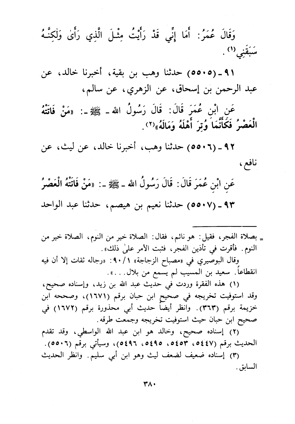 5505 - حَدَّثَنَا وَهْبُ بْنُ بَقِيَّةَ، أَخْبَرَنَا خَالِدٌ، عَنْ عَبْدِ الرَّحْمَنِ بْنِ إِسْحَاقَ، عَنِ الزُّهْرِيِّ، عَنْ سَالِمٍ، عَنِ ابْنِ عُمَرَ قَالَ: قَالَ رَسُولُ اللَّهِ صَلَّى اللهُ عَلَيْهِ وَسَلَّمَ: «§مَنْ فَاتَتْهُ الْعَصْرُ فَكَأَنَّمَا وُتِرَ أَهْلَهُ وَمَالَهُ» Kإسناده صحيح