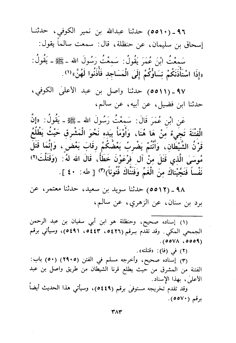 5510 - حَدَّثَنَا عَبْدُ اللَّهِ بْنُ نُمَيْرٍ الْكُوفِيُّ، حَدَّثَنَا إِسْحَاقُ بْنُ سُلَيْمَانَ، عَنْ حَنْظَلَةَ قَالَ: سَمِعْتُ سَالِمًا يَقُولُ: سَمِعْتُ ابْنَ عُمَرَ يَقُولُ: سَمِعْتُ رَسُولَ اللَّهِ صَلَّى اللهُ عَلَيْهِ وَسَلَّمَ يَقُولُ: «§إِذَا اسْتَأْذَنَكُمْ نِسَاؤُكُمْ إِلَى الْمَسَاجِدِ فَأْذَنُوا لَهُنَّ» Kإسناده صحيح