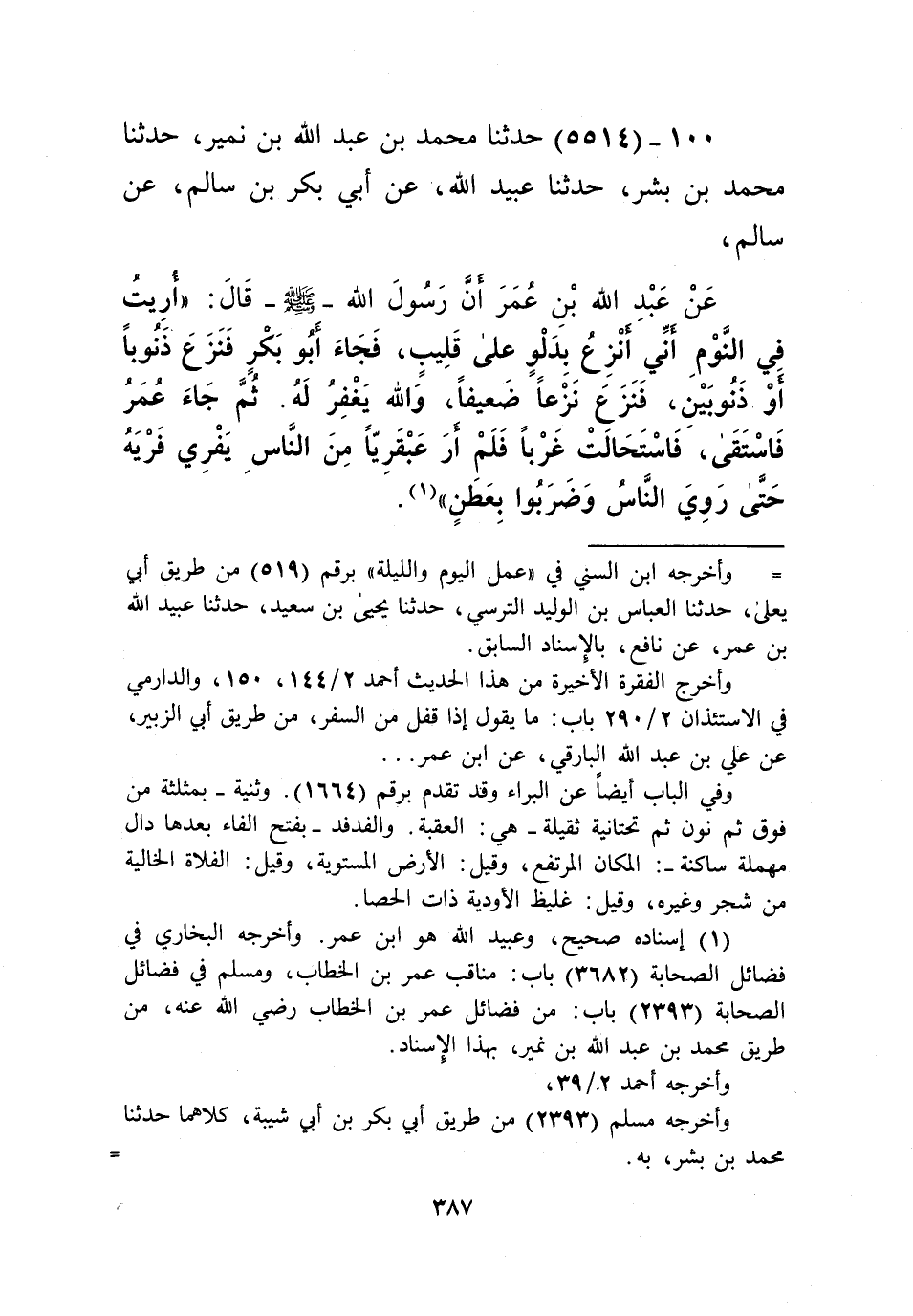 5514 - حَدَّثَنَا مُحَمَّدُ بْنُ عَبْدِ اللَّهِ بْنِ نُمَيْرٍ، حَدَّثَنَا مُحَمَّدُ بْنُ بِشْرٍ، حَدَّثَنَا عُبَيْدُ اللَّهِ، عَنْ أَبِي بَكْرِ بْنِ سَالِمٍ، عَنْ سَالِمٍ، عَنْ عَبْدِ اللَّهِ بْنِ عُمَرَ، أَنَّ رَسُولَ اللَّهِ صَلَّى اللهُ عَلَيْهِ وَسَلَّمَ قَالَ: «§أُرِيتُ فِي النَّوْمِ أَنِّي أَنْزِعُ بِدَلْوٍ عَلَى قَلِيبٍ، فَجَاءَ أَبُو بَكْرٍ فَنَزَعَ ذَنُوبًا أَوْ ذَنُوبَيْنِ، فَنَزَعَ نَزْعًا ضَعِيفًا، وَاللَّهُ يَغْفِرُ لَهُ، ثُمَّ جَاءَ عُمَرُ فَاسْتَقَى، فَاسْتَحَالَتْ غَرْبًا، فَلَمْ أَرَ عَبْقَرِيًّا مِنَ النَّاسِ يَفْرِي فَرْيَهُ، حَتَّى رَوِيَ النَّاسُ، وَضَرَبُوا بِعَطَنٍ» Kإسناده صحيح