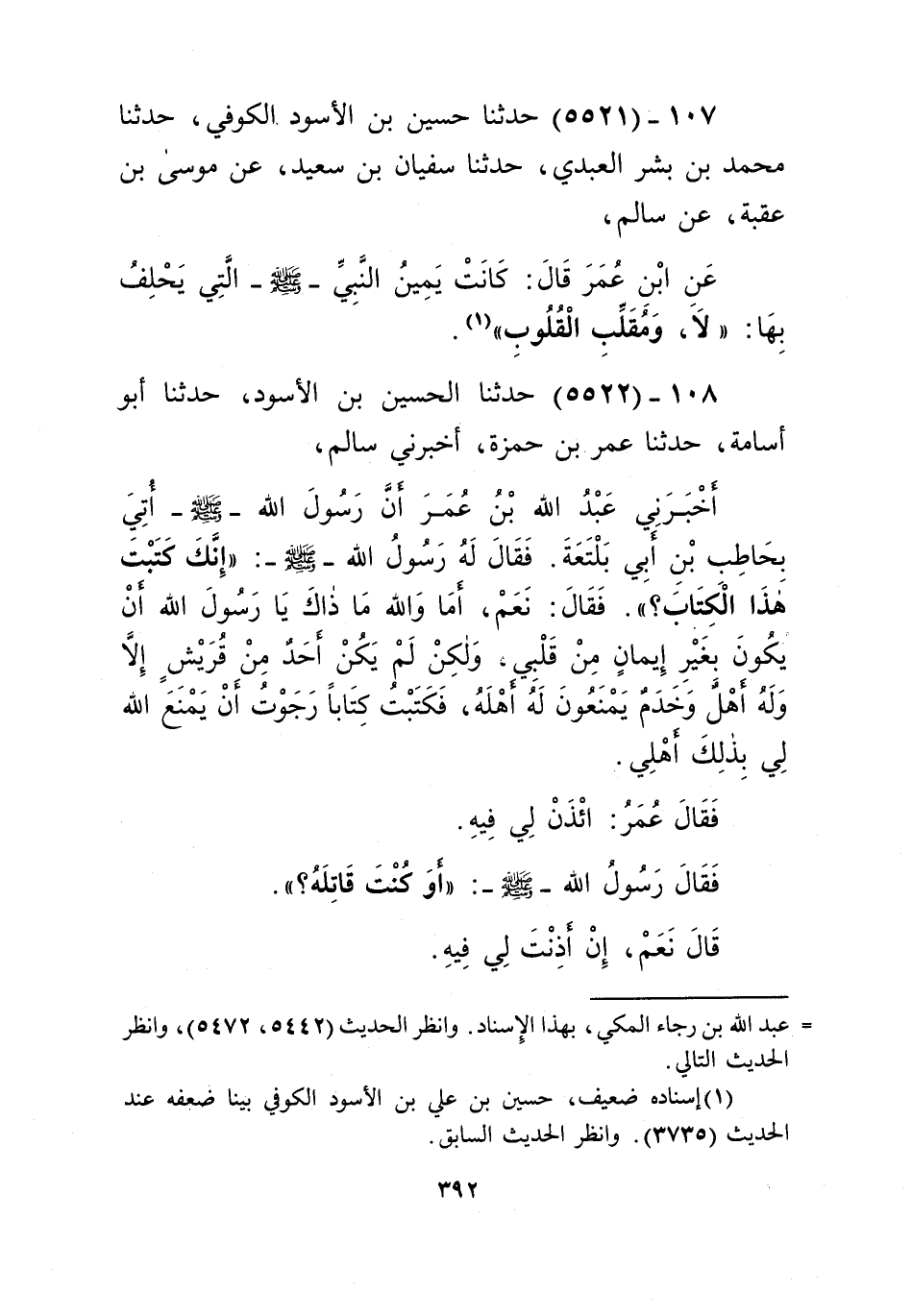 5521 - حَدَّثَنَا حُسَيْنُ بْنُ الْأَسْوَدِ الْكُوفِيُّ، حَدَّثَنَا مُحَمَّدُ بْنُ بِشْرٍ الْعَبْدِيُّ، حَدَّثَنَا سُفْيَانُ بْنُ سَعِيدٍ، عَنْ مُوسَى بْنِ عُقْبَةَ، عَنْ سَالِمٍ، عَنِ ابْنِ عُمَرَ قَالَ: كَانَتْ يَمِينُ النَّبِيِّ صَلَّى اللهُ عَلَيْهِ وَسَلَّمَ الَّتِي يَحْلِفُ بِهَا: «§لَا وَمُقَلِّبِ الْقُلُوبِ» Kإسناده ضعيف