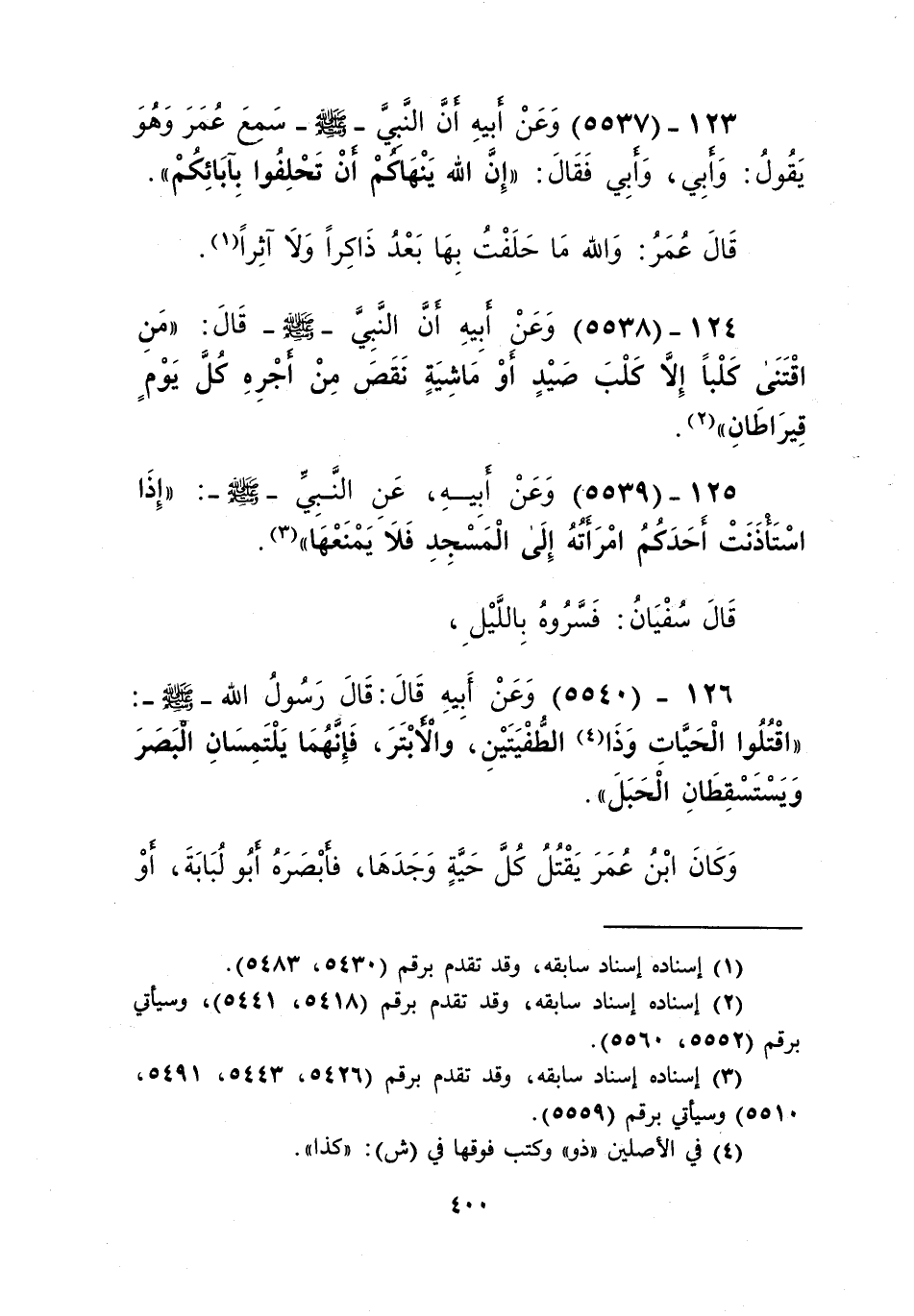 5540 - وَعَنْ أَبِيهِ قَالَ: قَالَ رَسُولُ اللَّهِ صَلَّى اللهُ عَلَيْهِ وَسَلَّمَ: «§اقْتُلُوا الْحَيَّاتِ، وَذَا الطُّفْيَتَيْنِ، وَالْأَبْتَرَ فَإِنَّهُمَا يَلْتَمِسَانِ الْبَصَرَ، وَيَسْتَسْقِطَانِ الْحَبَلَ» Kإسناده صحيح