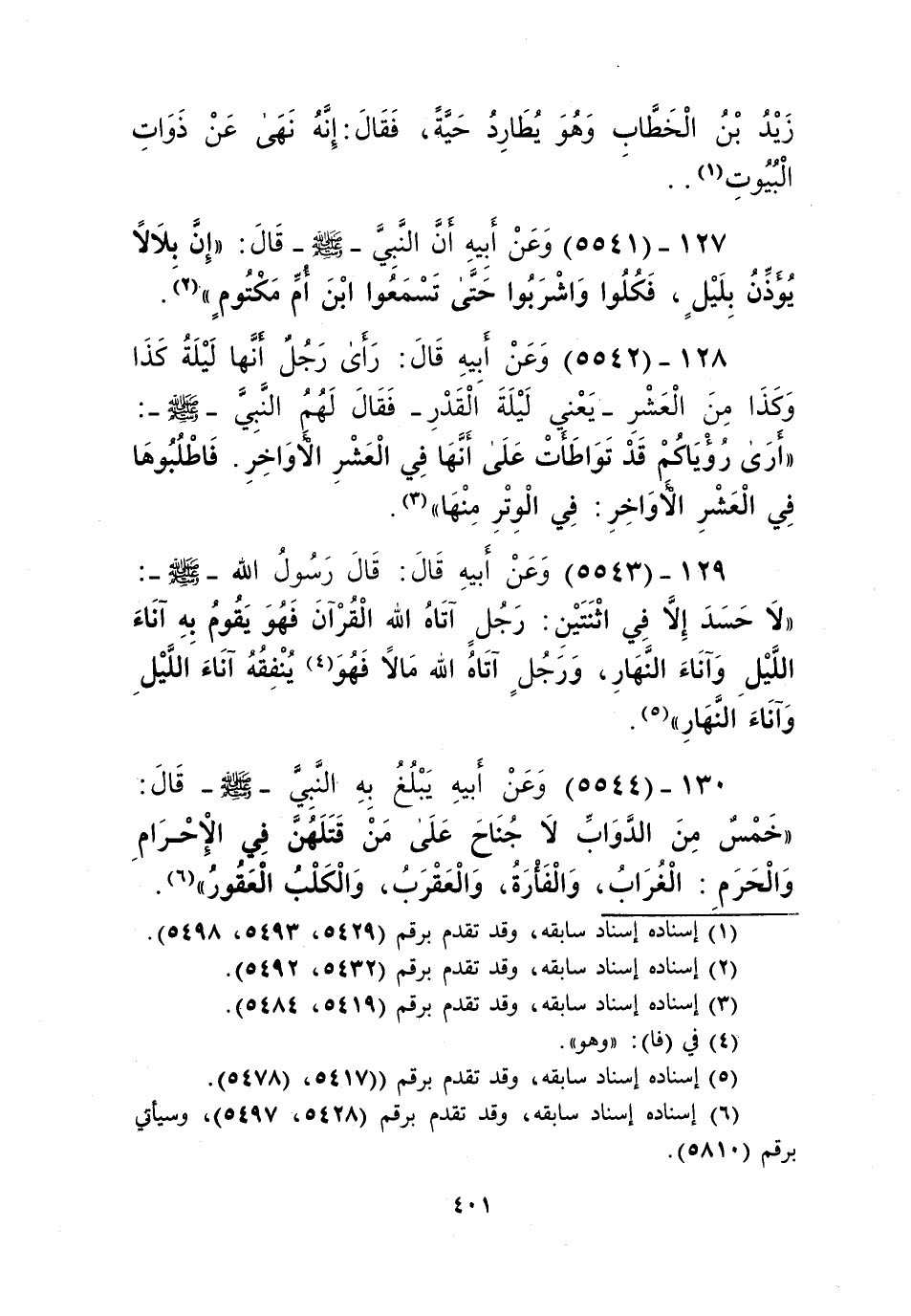 5544 - وَعَنْ أَبِيهِ، يَبْلُغُ بِهِ النَّبِيَّ صَلَّى اللهُ عَلَيْهِ وَسَلَّمَ قَالَ: " §خَمْسٌ مِنَ الدَّوَابِّ لَا جُنَاحَ عَلَى مَنْ قَتْلَهُنَّ فِي الْإِحْرَامِ، وَالْحَرَمِ: الْغُرَابُ، وَالْفَأْرَةُ، وَالْعَقْرَبُ، وَالْكَلْبُ الْعَقُورُ "، قَالَ سُفْيَانُ: وَالْأَسَدُ، وَالذِّئْبُ، وَالزُّنْبُورُ الْعَقُورُKإسناده صحيح