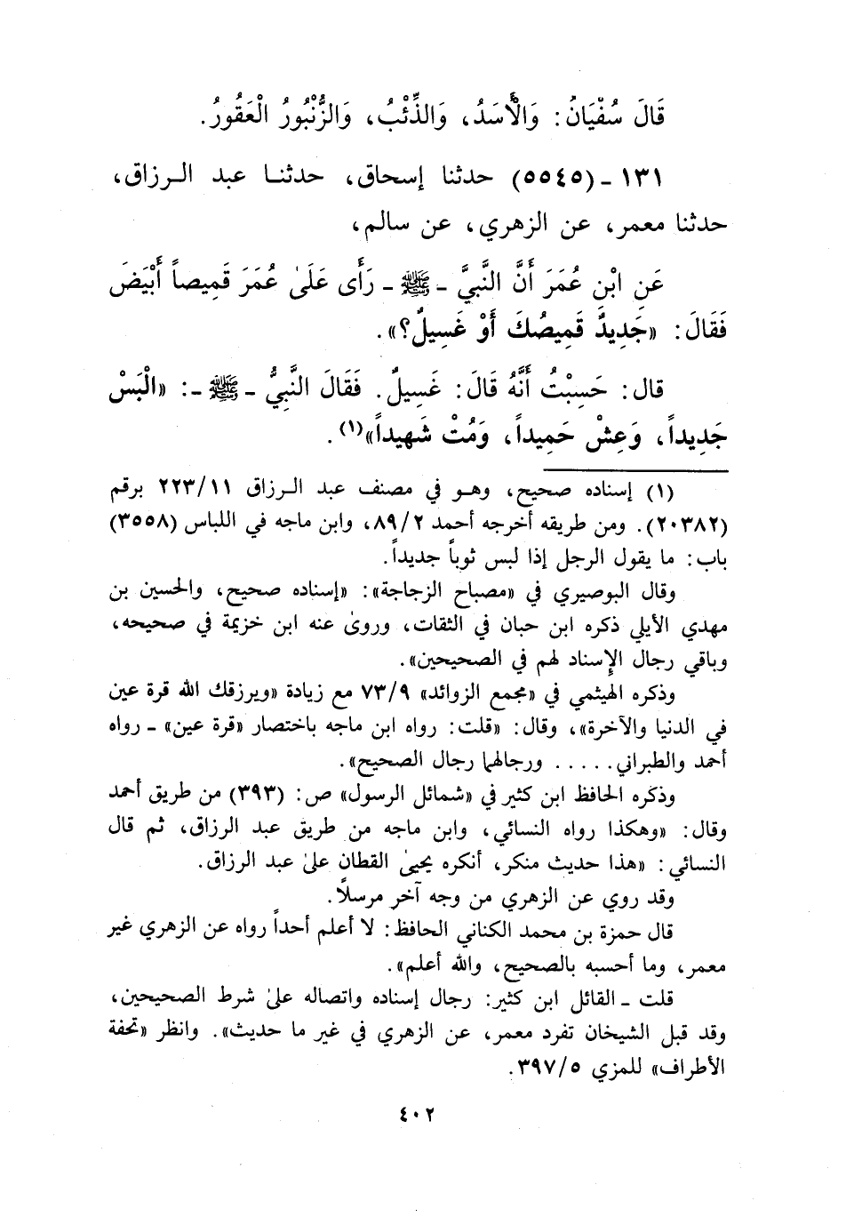 5545 - حَدَّثَنَا إِسْحَاقُ، حَدَّثَنَا عَبْدُ الرَّزَّاقِ، حَدَّثَنَا مَعْمَرٌ، عَنِ الزُّهْرِيِّ، عَنُ سَالِمٍ، عَنِ ابْنِ عُمَرَ، أَنَّ النَّبِيَّ صَلَّى اللهُ عَلَيْهِ وَسَلَّمَ رَأَى عَلَى عُمَرَ قَمِيصًا أَبْيَضَ، فَقَالَ: «جَدِيدٌ قَمِيصُكَ أَوْ غَسِيلٌ؟»، قَالَ: حَسِبْتُ أَنَّهُ قَالَ: غَسِيلٌ، فَقَالَ النَّبِيُّ صَلَّى اللهُ عَلَيْهِ وَسَلَّمَ: «§الْبَسْ جَدِيدًا، وَعِشْ حَمِيدًا، وَمُتْ شَهِيدًا» Kإسناده صحيح