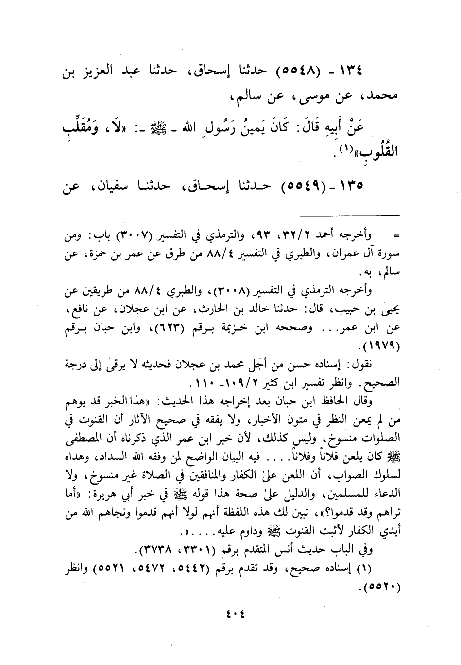 5548 - حَدَّثَنَا إِسْحَاقُ، حَدَّثَنَا عَبْدُ الْعَزِيزِ بْنُ مُحَمَّدٍ، عَنْ مُوسَى، عَنْ سَالِمٍ، عَنْ أَبِيهِ قَالَ: كَانَ يَمِينُ رَسُولِ اللَّهِ صَلَّى اللهُ عَلَيْهِ وَسَلَّمَ: «§لَا وَمُقَلِّبِ الْقُلُوبِ» Kإسناده صحيح