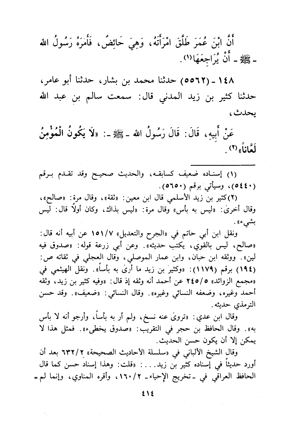 5562 - حَدَّثَنَا مُحَمَّدُ بْنُ بَشَّارٍ، حَدَّثَنَا أَبُو عَامِرٍ، حَدَّثَنَا كَثِيرُ بْنُ زَيْدٍ الْمَدَنِيُّ، قَالَ: سَمِعْتُ سَالِمَ بْنَ عَبْدِ اللَّهِ، يُحَدِّثُ، عَنْ أَبِيهِ قَالَ: قَالَ رَسُولُ اللَّهِ صَلَّى اللهُ عَلَيْهِ وَسَلَّمَ: «§لَا يَكُونُ الْمُؤْمِنُ لَعَّانًا»