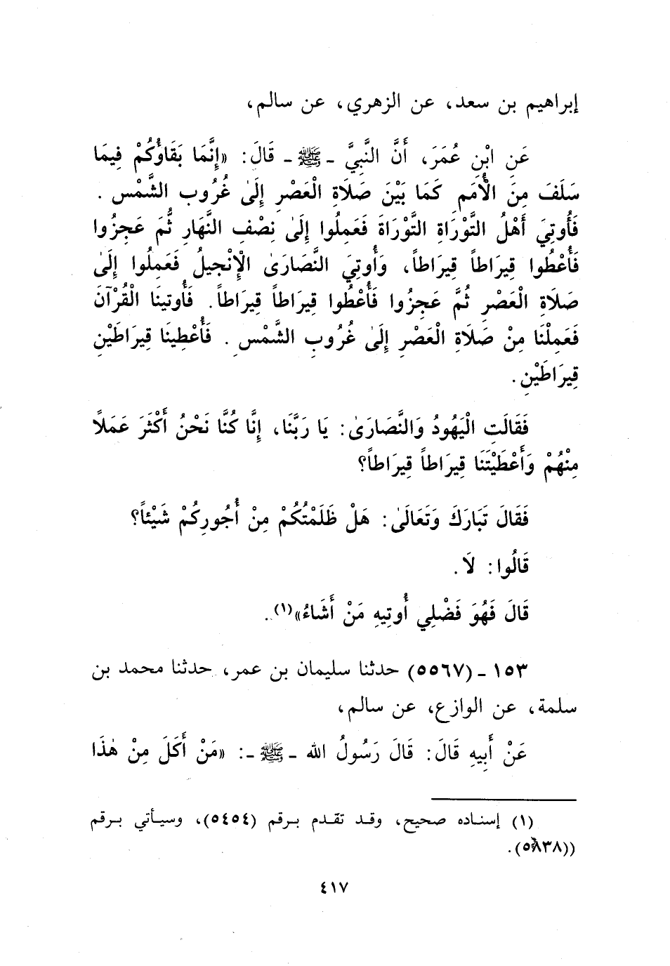 5567 - حَدَّثَنَا سُلَيْمَانُ بْنُ عُمَرَ، حَدَّثَنَا مُحَمَّدُ بْنُ سَلَمَةَ، عَنِ الْوَازِعِ، عَنْ سَالِمٍ، عَنْ أَبِيهِ، قَالَ: قَالَ رَسُولُ اللَّهِ صَلَّى اللهُ عَلَيْهِ وَسَلَّمَ: «§مَنْ أَكَلَ مِنْ هَذَا اللَّحْمِ شَيْئًا فَلْيَغْسِلْ يَدَهُ مِنْ رِيحِ وَضَرِهِ، لَا يُؤْذِي مَنْ حِذَاءَهُ» Kإسناده ضعيف جدا