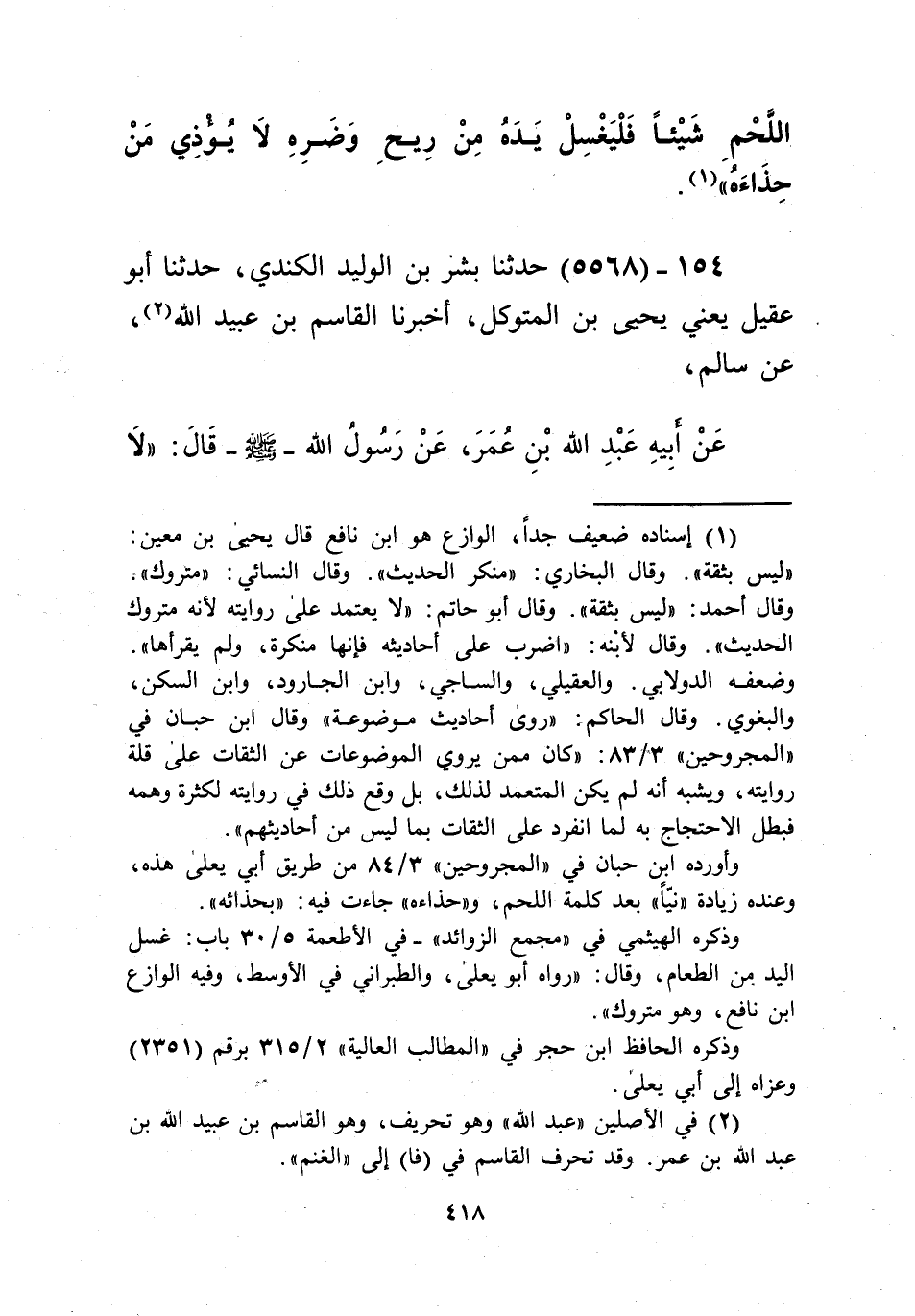 5568 - حَدَّثَنَا بِشْرُ بْنُ الْوَلِيدِ الْكِنْدِيُّ، حَدَّثَنَا أَبُوعَقِيلٍ - يَعْنِي: يَحْيَى بْنَ الْمُتَوَكِّلِ -، أَخْبَرَنَا الْقَاسِمُ بْنُ عُبَيْدِ اللَّهِ، عَنْ سَالِمٍ، عَنْ أَبِيهِ عَبْدِ اللَّهِ بْنِ عُمَرَ، عَنْ رَسُولِ اللَّهِ صَلَّى اللهُ عَلَيْهِ وَسَلَّمَ قَالَ: «§لَا -[419]- تَأْكُلُوا بِشِمَالِكُمْ، وَلَا تَشْرَبُوا بِهَا، فَإِنَّ الشَّيْطَانَ يَأْكُلُ بِهَا، وَيَشْرَبُ بِهَا» Kإسناده ضعيف