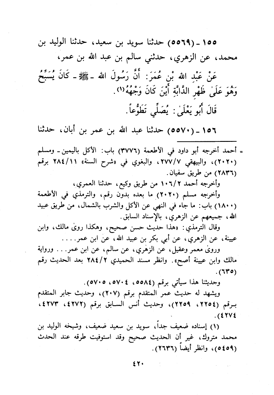 5569 - حَدَّثَنَا سُوَيْدُ بْنُ سَعِيدٍ، حَدَّثَنَا الْوَلِيدُ بْنُ مُحَمَّدٍ، عَنِ الزُّهْرِيِّ، حَدَّثَنِي سَالِمُ بْنُ عَبْدِ اللَّهِ بْنِ عُمَرَ، عَنْ عَبْدِ اللَّهِ بْنِ عُمَرَ، «أَنَّ رَسُولَ اللَّهِ صَلَّى اللهُ عَلَيْهِ وَسَلَّمَ كَانَ §يُسَبِّحُ وَهُوَ عَلَى ظَهْرِ الدَّابَّةِ أَيْنَ كَانَ وَجْهُهُ»، قَالَ أَبُو يَعْلَى: يُصَلِّي تَطَوُّعًاKإسناده ضعيف جدا
