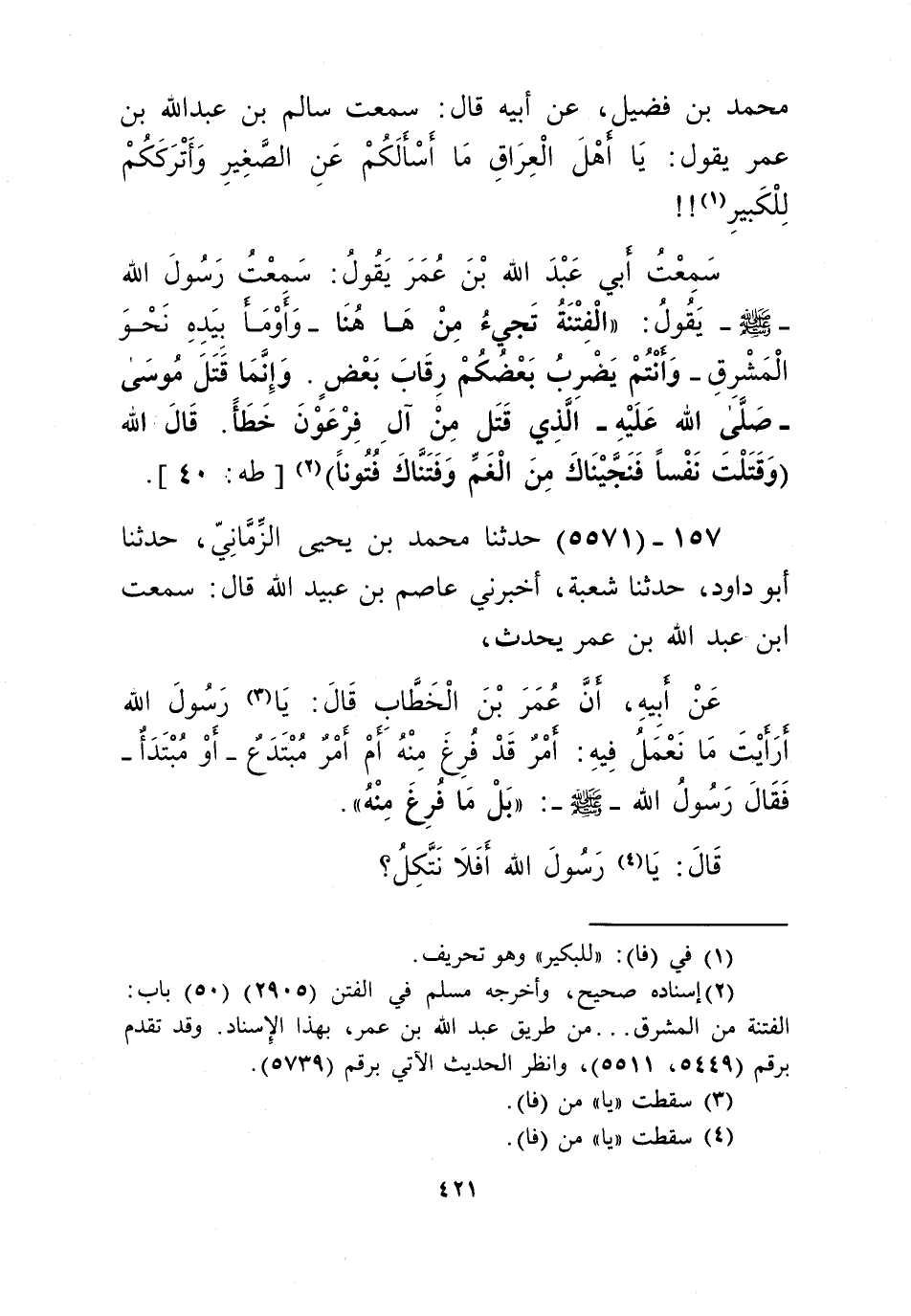 5571 - حَدَّثَنَا مُحَمَّدُ بْنُ يَحْيَى الزِّمَّانِيُّ، حَدَّثَنَا أَبُو دَاوُدَ، حَدَّثَنَا شُعْبَةُ، أَخْبَرَنِي عَاصِمُ بْنُ عُبَيْدِ اللَّهِ، قَالَ: سَمِعْتُ ابْنَ عَبْدِ اللَّهِ بْنِ عُمَرَ، يُحَدِّثُ عَنْ أَبِيهِ، أَنَّ عُمَرَ بْنَ الْخَطَّابِ، قَالَ: يَا رَسُولَ اللَّهِ، أَرَأَيْتَ مَا نَعْمَلُ فِيهِ، أَمْرٌ قَدْ فُرِغَ مِنْهُ، أُمْ أَمْرٌ مُبْتَدَعٌ أَوْ مُبْتَدَأٌ؟ فَقَالَ رَسُولُ اللَّهِ صَلَّى اللهُ عَلَيْهِ وَسَلَّمَ: «بَلْ مَا فُرِغَ مِنْهُ». قَالَ يَا رَسُولَ اللَّهِ: أَفَلَا نَتَّكِلُ، قَالَ: «§اعْمَلُوا، فَكُلٌّ مُيَسَّرٌ، إِنَّهُ مَنْ كَانَ مِنْ أَهْلِ السَّعَادَةِ عَمِلَ لِلسَّعَادَةِ، وَمَنْ كَانَ مِنْ أَهْلِ الشَّقَاءِ، عَمِلَ لِلشَّقَاءِ» Kإسناده ضعيف