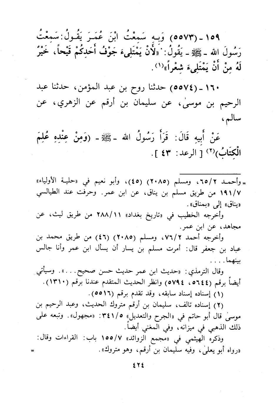5574 - حَدَّثَنَا رَوْحُ بْنُ عَبْدِ الْمُؤْمِنِ، حَدَّثَنَا عَبْدُ الرَّحِيمِ بْنُ مُوسَى، عَنْ سُلَيْمَانَ بْنِ أَرْقَمَ، عَنِ الزُّهْرِيِّ، عَنْ سَالِمٍ، عَنْ أَبِيهِ، قَالَ: قَرَأَ رَسُولُ اللَّهِ صَلَّى اللهُ عَلَيْهِ وَسَلَّمَ: " {§وَمَنْ عِنْدَهُ عِلْمُ الْكِتَابِ} [الرعد: 43] "Kإسناده تالف