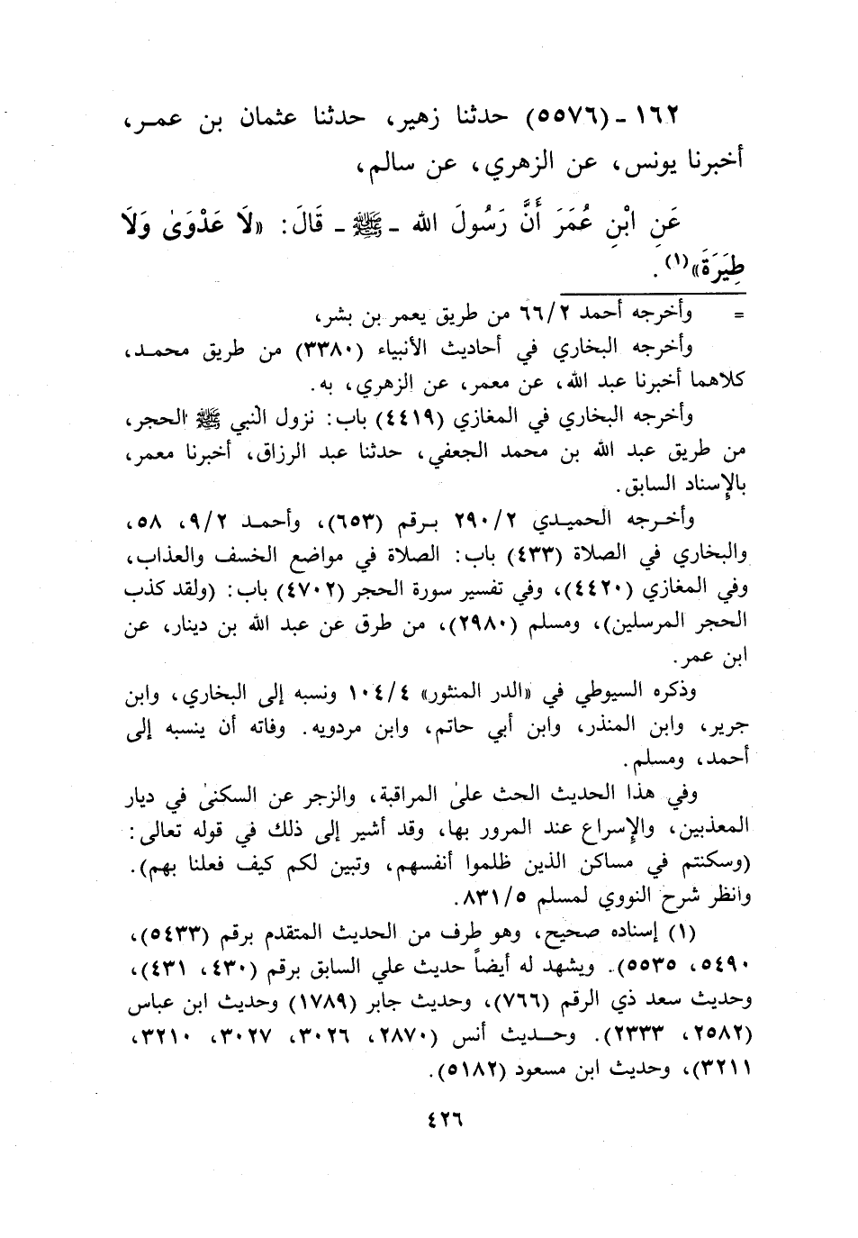 5576 - حَدَّثَنَا زُهَيْرٌ، حَدَّثَنَا عُثْمَانُ بْنُ عُمَرَ، أَخْبَرَنَا يُونُسُ، عَنِ الزُّهْرِيِّ، عَنُ سَالِمٍ، عَنِ ابْنِ عُمَرَ، أَنَّ رَسُولَ اللَّهِ صَلَّى اللهُ عَلَيْهِ وَسَلَّمَ قَالَ: «§لَا عَدْوَى وَلَا طِيَرَةَ» Kإسناده صحيح