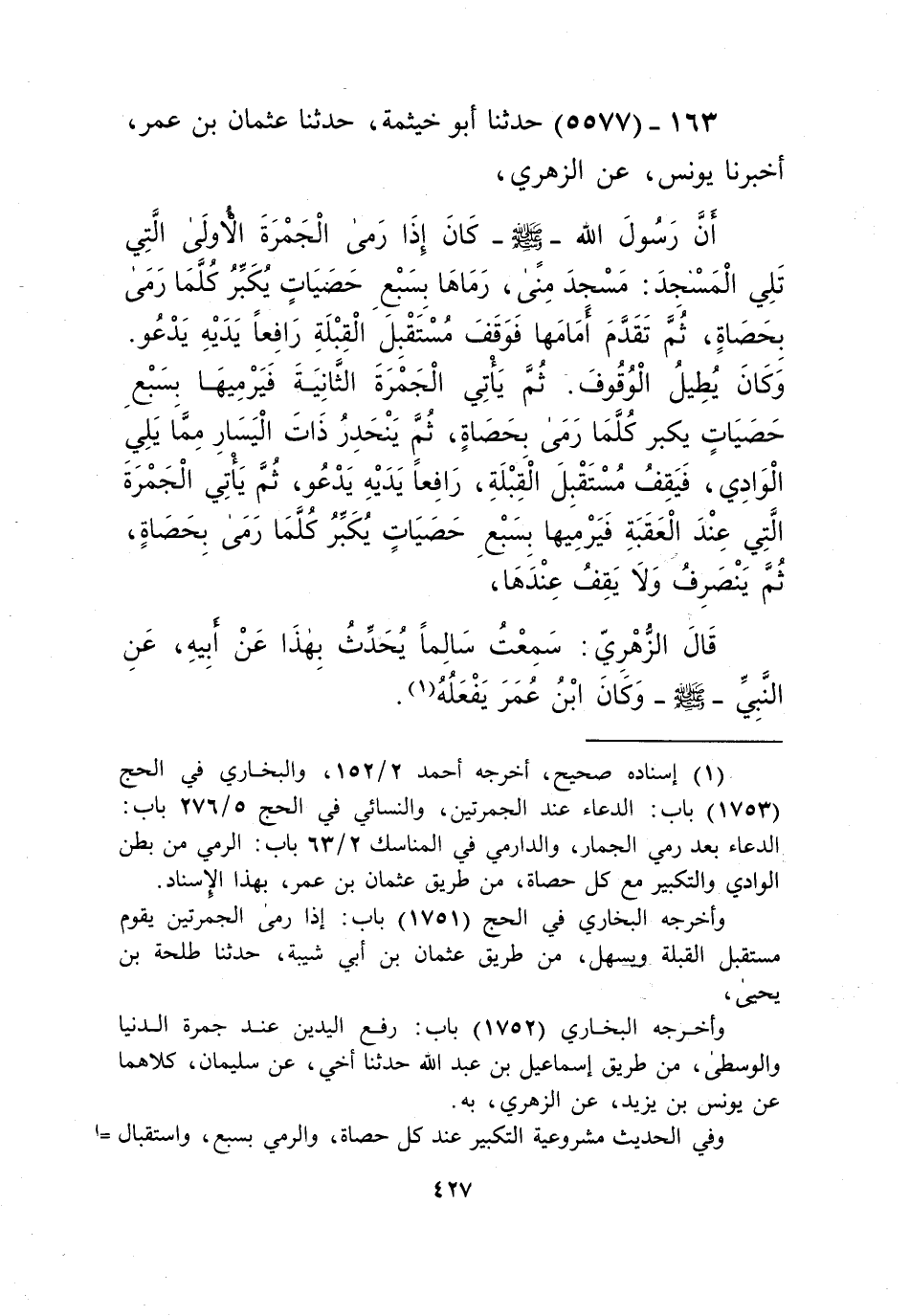 5577 - حَدَّثَنَا أَبُو خَيْثَمَةَ، حَدَّثَنَا عُثْمَانُ بْنُ عُمَرَ، أَخْبَرَنَا يُونُسُ، عَنِ الزُّهْرِيِّ، «أَنَّ رَسُولَ اللَّهِ صَلَّى اللهُ عَلَيْهِ وَسَلَّمَ كَانَ §إِذَا رَمَى الْجَمْرَةَ الْأُولَى الَّتِي تَلِي الْمَسْجِدَ، مَسْجِدَ مِنًى رَمَاهَا بِسَبْعِ حَصَيَاتٍ، يُكَبِّرُ كُلَّمَا رَمَى بِحَصَاةٍ، ثُمَّ تَقَدَّمَ أَمَامَهَا فَوَقَفَ مُسْتَقْبِلًا الْقِبْلَةَ رَافِعًا يَدَيْهِ يَدْعُو وَكَانَ يُطِيلُ الْوُقُوفَ، ثُمَّ يَأْتِي الْجَمْرَةَ الثَّانِيَةَ فَيَرْمِيهَا بِسَبْعِ حَصَيَاتٍ يُكَبِّرُ كُلَّمَا رَمَى بِحَصَاةٍ، ثُمَّ يَنْحَدِرُ ذَاتَ الْيَسَارِ مِمَّا يَلِي الْوَادِيَ، فَيَقِفُ مُسْتَقْبِلَ الْقِبْلَةِ رَافِعًا يَدَيْهِ يَدْعُو، ثُمَّ يَأْتِي الْجَمْرَةَ الَّتِي عِنْدَ الْعَقَبَةِ فَيَرْمِيهَا بِسَبْعِ حَصَيَاتٍ يُكَبِّرُ كُلَّمَا رَمَى بِحَصَاةٍ، ثُمَّ يَنْصَرِفُ وَلَا يَقِفُ عِنْدَهَا» قَالَ الزُّهْرِيُّ: سَمِعْتُ سَالِمًا، يُحَدِّثُ بِهَذَا عَنْ أَبِيهِ، عَنِ النَّبِيِّ صَلَّى اللهُ عَلَيْهِ وَسَلَّمَ وَكَانَ ابْنُ عُمَرَ يَفْعَلُهُKإسناده صحيح