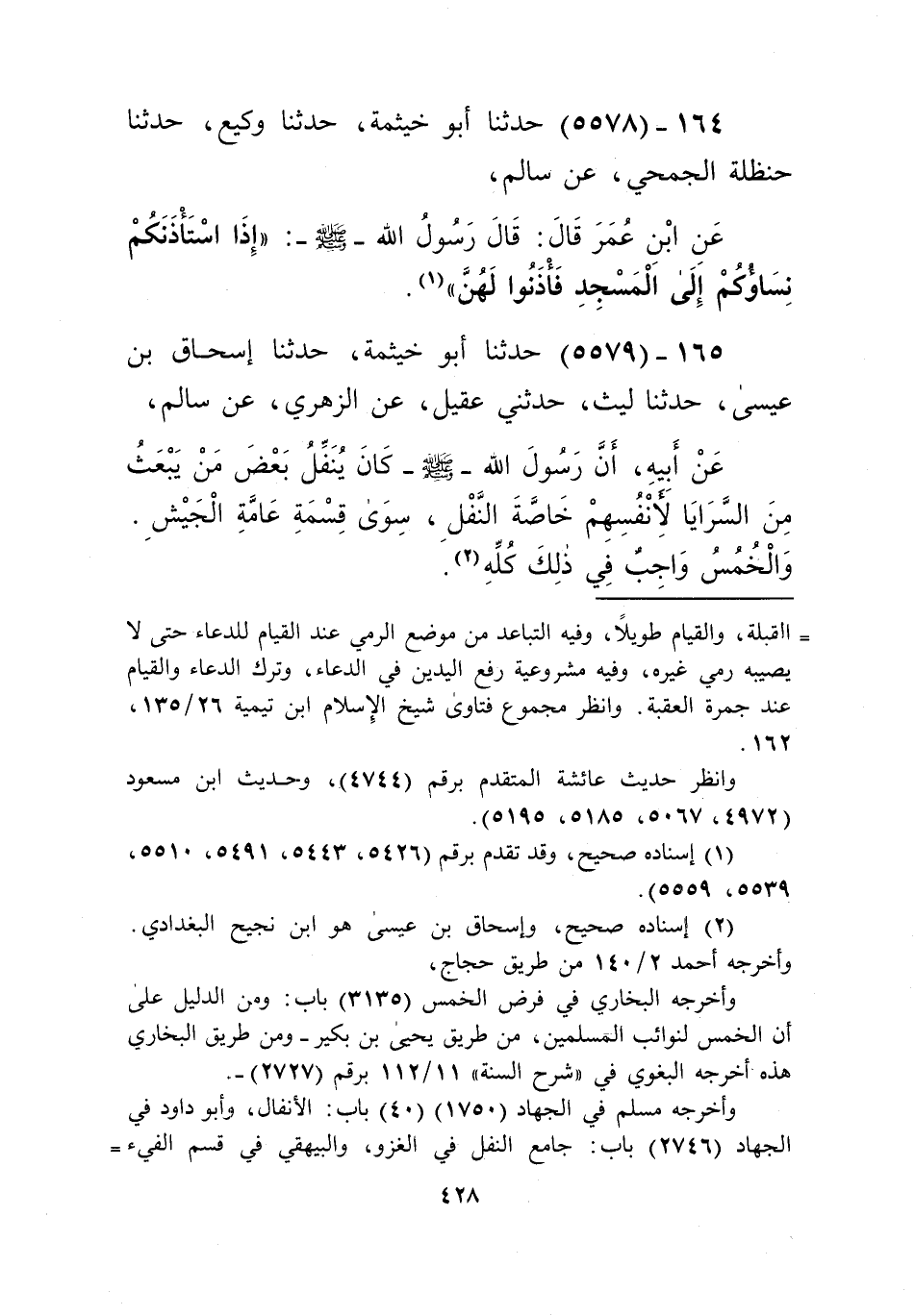 5579 - حَدَّثَنَا أَبُو خَيْثَمَةَ، حَدَّثَنَا إِسْحَاقُ بْنُ عِيسَى، حَدَّثَنَا لَيْثٌ، حَدَّثَنِي عُقَيْلٌ، عَنِ الزُّهْرِيِّ، عَنْ سَالِمٍ، عَنْ أَبِيهِ، «أَنَّ رَسُولَ اللَّهِ صَلَّى اللهُ عَلَيْهِ وَسَلَّمَ كَانَ §يُنَفِّلُ بَعْضَ مَنْ يَبْعَثُ مِنَ السَّرَايَا لِأَنْفُسِهِمْ خَاصَّةً النَّفَلِ سِوَى قِسْمَةِ عَامَّةِ الْجَيْشِ، وَالْخُمْسُ وَاجِبٌ فِي ذَلِكَ كُلِّهِ» Kإسناده صحيح