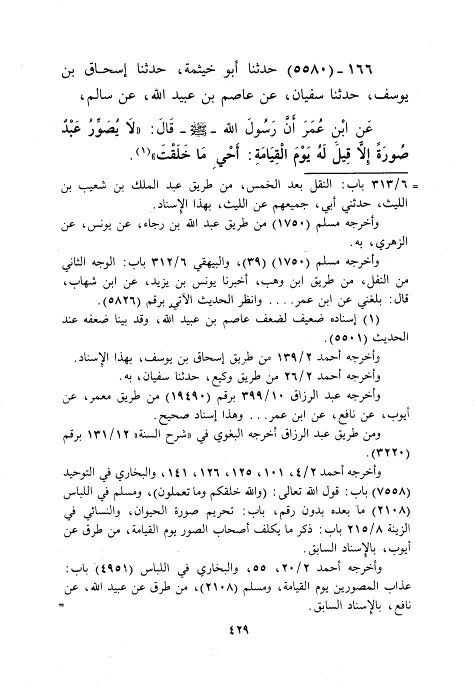 5580 - حَدَّثَنَا أَبُو خَيْثَمَةَ، حَدَّثَنَا إِسْحَاقُ بْنُ يُوسُفَ، حَدَّثَنَا سُفْيَانُ، عَنْ عَاصِمِ بْنِ عُبَيْدِ اللَّهِ، عَنْ سَالِمٍ، عَنِ ابْنِ عُمَرَ، أَنَّ رَسُولَ اللَّهِ صَلَّى اللهُ عَلَيْهِ وَسَلَّمَ قَالَ: " §لَا يُصَوِّرُ عَبْدٌ صُورَةً إِلَّا قِيلَ لَهُ يَوْمَ الْقِيَامَةِ: أَحْيِ مَا خَلَقْتَ "Kإسناده ضعيف