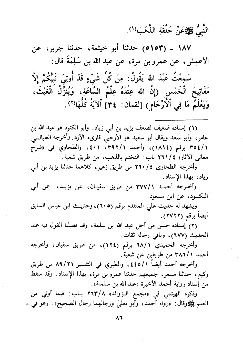 5153 - حَدَّثَنَا أَبُو خَيْثَمَةَ، حَدَّثَنَا جَرِيرٌ، عَنِ الْأَعْمَشِ، عَنْ عَمْرِو بْنِ مُرَّةَ، عَنْ عَبْدِ اللَّهِ بْنِ سَلَمَةَ قَالَ: سَمِعْتُ عَبْدَ اللَّهِ يَقُولُ: " §مِنْ كُلِّ شَيْءٍ قَدْ أُوتِيَ نَبِيُّكُمْ، إِلَّا مَفَاتِيحَ الْخَمْسِ: {إِنَّ اللَّهَ عِنْدَهُ عِلْمُ السَّاعَةِ وَيُنَزِّلُ الْغَيْثَ وَيَعْلَمُ مَا فِي الْأَرْحَامِ} [لقمان: 34] الْآيَةُ كُلُّهَاKإسناده حسن