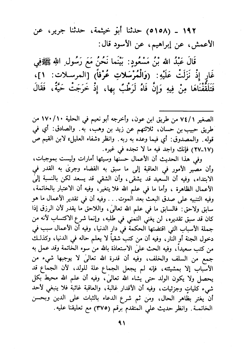 5158 - حَدَّثَنَا أَبُو خَيْثَمَةَ، حَدَّثَنَا جَرِيرٌ، عَنِ الْأَعْمَشِ، عَنْ إِبْرَاهِيمَ، عَنِ الْأَسْوَدِ قَالَ: قَالَ عَبْدُ اللَّهِ بْنُ مَسْعُودٍ: بَيْنَمَا نَحْنُ مَعَ رَسُولِ اللَّهِ صَلَّى اللهُ عَلَيْهِ وَسَلَّمَ فِي غَارٍ إِذْ نَزَلَتْ عَلَيْهِ: وَالْمُرْسَلَاتِ عُرْفًا، فَتَلَقَّفْنَاهَا مِنْ فِيهِ، وَإِنَّ فَاهُ لَرَطْبٌ بِهَا، إِذْ خَرَجَتْ حَيَّةٌ، فَقَالَ رَسُولُ اللَّهِ صَلَّى اللهُ عَلَيْهِ وَسَلَّمَ: «اقْتُلُوهَا»، قَالَ: فَابْتَدَرْنَاهَا، فَسَبَقَتْنَا، فَقَالَ رَسُولُ اللَّهِ صَلَّى اللهُ عَلَيْهِ وَسَلَّمَ: «§وُقِيَتْ شَرَّكُمْ وَوُقِيتُمْ شَرَّهَا» Kإسناده صحيح