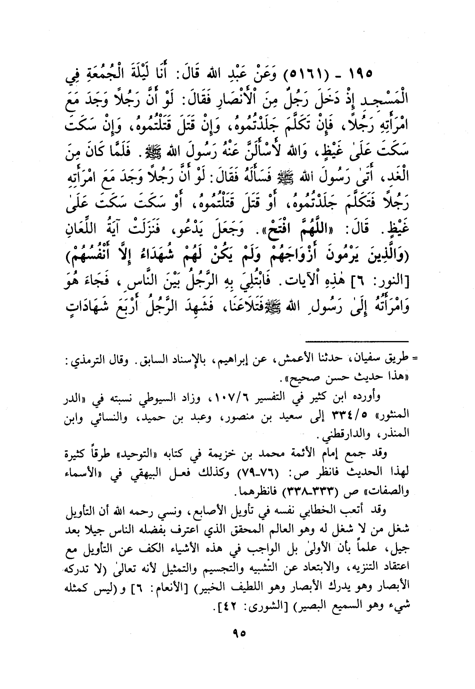 5161 - وَعَنْ عَبْدِ اللَّهِ قَالَ: إِنَّا لَيْلَةَ الْجُمُعَةِ فِي الْمَسْجِدِ إِذْ دَخَلَ رَجُلٌ مِنَ الْأَنْصَارِ فَقَالَ: لَوْ أَنَّ رَجُلًا وَجَدَ مَعَ امْرَأَتِهِ رَجُلًا، فَإِنْ تَكَلَّمَ جَلَدْتُمُوهُ، وَإِنْ قَتْلَ قَتَلْتُمُوهُ، وَإِنْ سَكَتَ سَكَتَ عَلَى غَيْظٍ، وَاللَّهِ لَأَسْأَلَنَّ عَنْهُ رَسُولَ اللَّهِ صَلَّى اللهُ عَلَيْهِ وَسَلَّمَ، فَلَمَّا كَانَ مِنَ الْغَدِ أَتَى رَسُولَ اللَّهِ صَلَّى اللهُ عَلَيْهِ وَسَلَّمَ، فَسَأَلَهُ فَقَالَ: لَوْ أَنَّ رَجُلًا وَجَدَ مَعَ امْرَأَتِهِ رَجُلًا فَتَكَلَّمَ جَلَدْتُمُوهُ، أَوْ قَتْلَ قَتَلْتُمُوهُ، أَوْ سَكَتَ سَكَتَ عَلَى غَيْظٍ، قَالَ: «§اللَّهُمَّ افْتَحْ»، وَجَعَلَ يَدْعُو، فَنَزَلَتْ أَيَّةُ اللِّعَانِ: {وَالَّذِينَ يَرْمُونَ أَزْوَاجَهُمْ وَلَمْ يَكُنْ لَهُمْ شُهَدَاءُ إِلَّا أَنْفُسُهُمْ} [النور: 6] هَذِهِ الْآيَاتُ، فَابْتُلِيَ بِهِ الرَّجُلُ بَيْنَ النَّاسِ، فَجَاءَ هُوَ وَامْرَأَتُهُ إِلَى رَسُولِ اللَّهِ صَلَّى اللهُ عَلَيْهِ وَسَلَّمَ، فَتَلَاعَنَا، فَشَهِدَ الرَّجُلُ أَرْبَعَ شَهَادَاتٍ بِاللَّهِ إِنَّهُ لِمَنَ الصَّادِقِينَ، ثُمَّ لَعَنَ الْخَامِسَةَ: أَنَّ لَعْنَةَ اللَّهِ عَلَيْهِ إِنْ كَانَ مِنَ الْكَاذِبِينَ، فَذَهَبَتْ لِتَلْتَعِنَ، فَقَالَ رَسُولُ اللَّهِ صَلَّى اللهُ عَلَيْهِ وَسَلَّمَ: «مَهْ»، فَلَعَنَتْ، فَلَمَّا أَدْبَرَا قَالَ: «لَعَلَّهَا أَنْ تَجِيءَ بِهِ أَسْوَدَ جَعْدًا»، فَجَاءَتْ بِهِ أَسْوَدَ جَعْدًاKإسناده صحيح