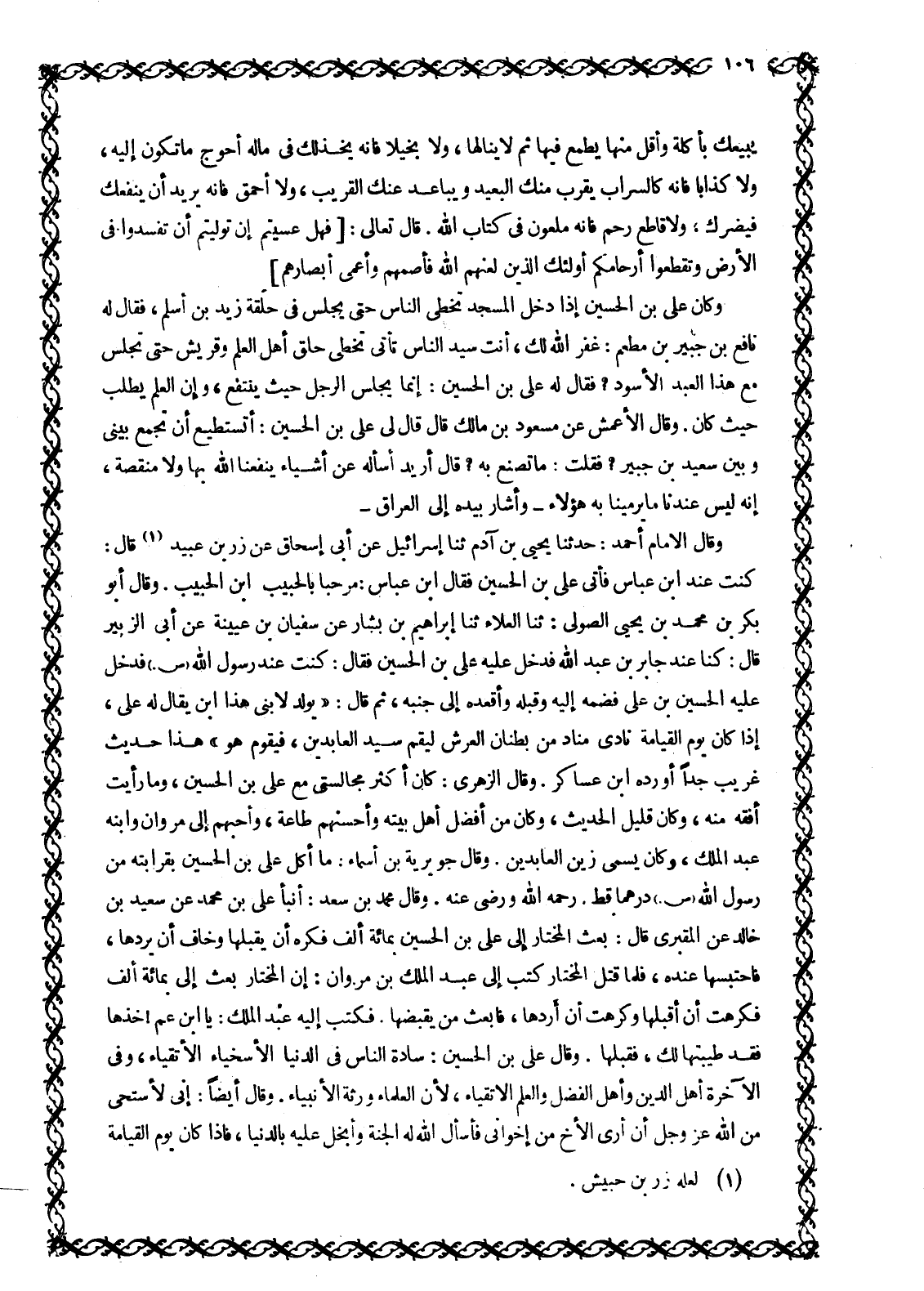 يَبِيعُكَ بِأَكْلَةٍ وَأَقَلَّ مِنْهَا يَطْمَعُ فِيهَا ثُمَّ لَا يَنَالُهَا، وَلَا بَخِيلًا فَإِنَّهُ يَخْذُلُكَ فِي مَالِهِ أَحْوَجَ مَا تَكُونُ إِلَيْهِ، وَلَا كَذَّابًا فَإِنَّهُ كَالسَّرَابِ يُقَرِّبُ مِنْكَ الْبَعِيدَ وَيُبَاعِدُ عَنْكَ الْقَرِيبَ، وَلَا أَحْمَقَ فَإِنَّهُ يُرِيدُ أَنْ يَنْفَعَكَ فَيَضُرُّكَ، وَلَا قَاطِعَ رَحِمٍ فَإِنَّهُ مَلْعُونٌ فِي كتاب الله. قال تَعَالَى: فَهَلْ عَسَيْتُمْ إِنْ تَوَلَّيْتُمْ أَنْ تُفْسِدُوا فِي الْأَرْضِ وَتُقَطِّعُوا أَرْحامَكُمْ أُولئِكَ الَّذِينَ لَعَنَهُمُ الله فَأَصَمَّهُمْ وَأَعْمى أَبْصارَهُمْ 47: 22- 23 وَكَانَ عَلِيُّ بْنُ الْحُسَيْنِ إِذَا دَخَلَ الْمَسْجِدَ تَخَطَّى النَّاسَ حَتَّى يَجْلِسَ فِي حَلْقَةِ زَيْدِ بْنِ أَسْلَمَ، فَقَالَ لَهُ نَافِعُ بْنُ جُبَيْرِ بْنِ مُطْعِمٍ: غَفَرَ اللَّهُ لَكَ، أَنْتَ سَيِّدُ الناس تأتى تخطي حلق أهل العلم وقريش حَتَّى تَجْلِسَ مَعَ هَذَا الْعَبْدِ الْأَسْوَدِ؟ فَقَالَ لَهُ عَلِيُّ بْنُ الْحُسَيْنِ: إِنَّمَا يَجْلِسُ الرَّجُلُ حيث ينتفع، وإن العلم يطلب حَيْثُ كَانَ. وَقَالَ الْأَعْمَشُ عَنْ مَسْعُودِ بْنِ مَالِكٍ قَالَ قَالَ لِي عَلِيُّ بْنُ الْحُسَيْنِ: أَتَسْتَطِيعُ أَنْ تَجْمَعَ بَيْنِي وَبَيْنَ سَعِيدِ بْنِ جُبَيْرٍ؟ فَقُلْتُ: مَا تَصْنَعُ بِهِ؟ قَالَ أُرِيدُ أسأله عن أشياء ينفعنا الله بها ولا منقصة، إِنَّهُ لَيْسَ عِنْدَنَا مَا يَرْمِينَا بِهِ هَؤُلَاءِ- وَأَشَارَ بِيَدِهِ إِلَى الْعِرَاقِ- وَقَالَ الْإِمَامُ أَحْمَدُ: حَدَّثَنَا يَحْيَى بْنُ آدَمَ ثَنَا إِسْرَائِيلُ عَنْ أَبِي إسحاق عن زر بْنِ عُبَيْدٍ [1] قَالَ: كُنْتُ عِنْدَ ابْنِ عَبَّاسٍ فَأَتَى عَلِيُّ بْنُ الْحُسَيْنِ فَقَالَ ابْنُ عَبَّاسٍ: مَرْحَبًا بِالْحَبِيبِ ابْنِ الْحَبِيبِ. وَقَالَ أَبُو بَكْرِ بن محمد بن يحيى الصولي: ثنا العلاء ثَنَا إِبْرَاهِيمُ بْنُ بَشَّارٍ عَنْ سُفْيَانَ بْنِ عُيَيْنَةَ عَنْ أَبِي الزُّبَيْرِ قَالَ: كُنَّا عِنْدَ جَابِرِ بْنِ عَبْدِ اللَّهِ فَدَخَلَ عَلَيْهِ عَلِيُّ بْنُ الْحُسَيْنِ فَقَالَ: كُنْتُ عِنْدَ رَسُولِ اللَّهِ صَلَّى اللَّهُ عَلَيْهِ وَسَلَّمَ فَدَخَلَ عَلَيْهِ الْحُسَيْنُ بْنُ عَلِيٍّ فَضَمَّهُ إِلَيْهِ وَقَبَّلَهُ وَأَقْعَدَهُ إِلَى جنبه، ثم قال: «يولد لا بنى هَذَا ابْنٌ يُقَالُ لَهُ عَلِيٌّ، إِذَا كَانَ يَوْمُ الْقِيَامَةِ نَادَى مُنَادٍ مِنْ بُطْنَانِ الْعَرْشِ لِيَقُمْ سَيِّدُ الْعَابِدِينَ، فَيَقُومُ هُوَ» هَذَا حَدِيثٌ غَرِيبٌ جِدًّا أَوْرَدَهُ ابْنُ عَسَاكِرَ. وَقَالَ الزُّهْرِيُّ: كَانَ أَكْثَرُ مُجَالَسَتِي مَعَ عَلِيِّ بْنِ الْحُسَيْنِ، وَمَا رَأَيْتُ أَفْقَهَ مِنْهُ، وَكَانَ قَلِيلَ الْحَدِيثِ، وَكَانَ مِنْ أَفْضَلِ أَهْلِ بَيْتِهِ وَأَحْسَنِهِمْ طَاعَةً، وَأَحَبِّهِمْ إِلَى مَرْوَانَ وَابْنِهِ عَبْدِ الْمَلِكِ، وَكَانَ يسمى زَيْنَ الْعَابِدِينَ. وَقَالَ جُوَيْرِيَّةُ بْنُ أَسْمَاءَ: مَا أَكَلَ عَلِيُّ بْنُ الْحُسَيْنِ بِقَرَابَتِهِ مِنْ رَسُولِ اللَّهِ صَلَّى اللَّهُ عَلَيْهِ وَسَلَّمَ دِرْهَمًا قَطُّ. رَحِمَهُ اللَّهُ وَرَضِيَ عَنْهُ. وَقَالَ مُحَمَّدُ بْنُ سَعْدٍ: أَنْبَأَ عَلِيُّ بْنُ مُحَمَّدٍ عَنْ سَعِيدِ بْنِ خَالِدٍ عَنِ الْمَقْبُرِيِّ قَالَ: بَعَثَ الْمُخْتَارُ إِلَى عَلِيِّ بْنِ الْحُسَيْنِ بِمِائَةِ أَلْفٍ فَكَرِهَ أَنْ يَقْبَلَهَا وَخَافَ أَنْ يَرُدَّهَا، فَاحْتَبَسَهَا عِنْدَهُ، فَلَمَّا قُتِلَ الْمُخْتَارُ كَتَبَ إِلَى عَبْدِ الْمَلِكِ بْنِ مَرْوَانَ: إِنَّ الْمُخْتَارَ بَعَثَ إِلَيَّ بِمِائَةِ أَلْفٍ فَكَرِهْتُ أَنْ أَقْبَلَهَا وَكَرِهْتُ أَنْ أَرُدَّهَا، فَابْعَثْ مَنْ يَقْبِضُهَا. فَكَتَبَ إِلَيْهِ عَبْدُ الْمَلِكِ: يَا ابْنَ عَمٍّ! خُذْهَا فَقَ