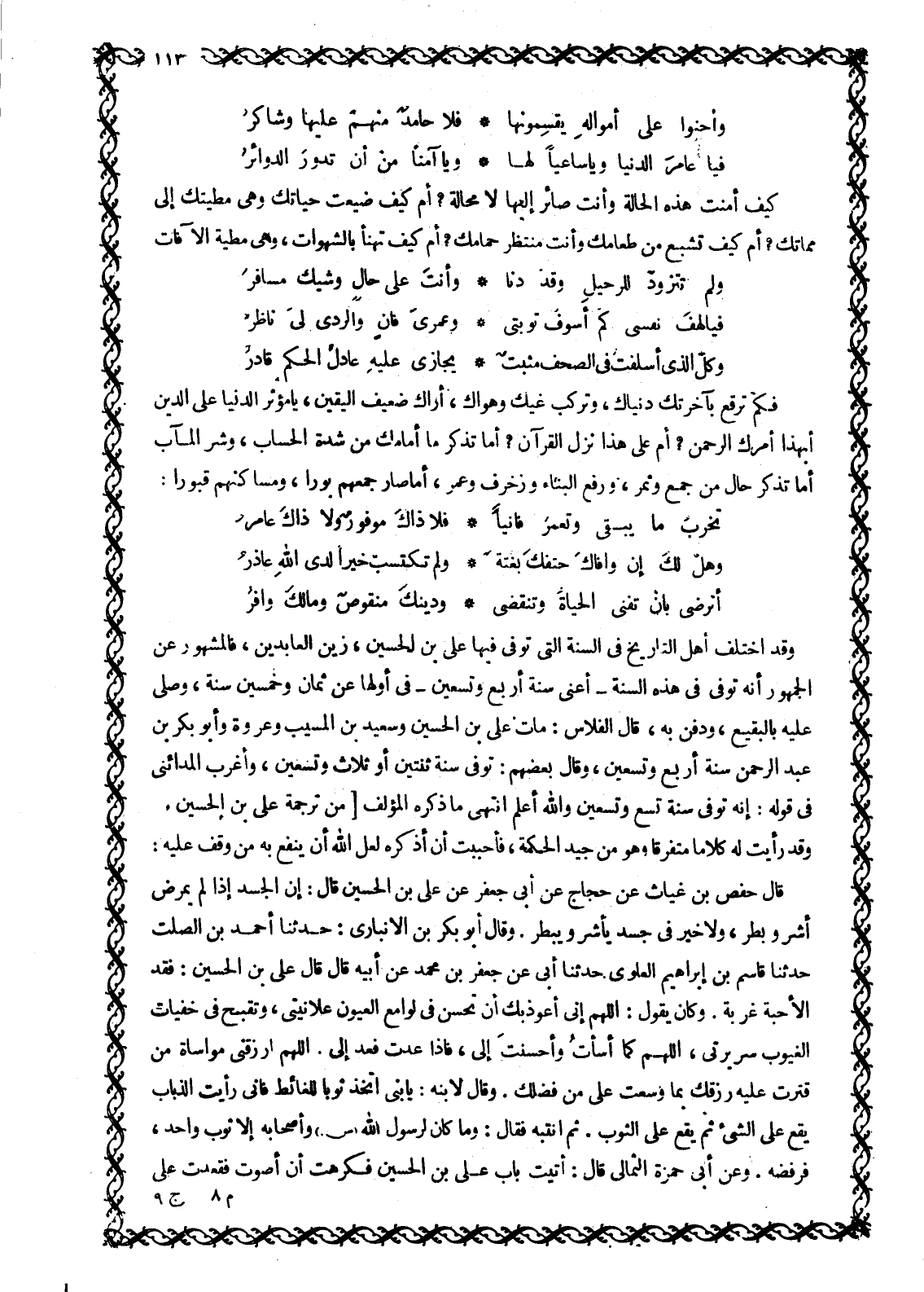 وَقَدِ اخْتَلَفَ أَهْلُ التَّارِيخِ فِي السَّنَةِ الَّتِي تُوَفِّيَ فِيهَا عَلِيُّ بْنُ الْحُسَيْنِ، زَيْنُ الْعَابِدِينَ، فَالْمَشْهُورُ عَنِ الْجُمْهُورِ أَنَّهُ تُوُفِّيَ فِي هَذِهِ السَّنَةِ- أَعْنِي سَنَةَ أَرْبَعٍ وَتِسْعِينَ- فِي أَوَّلِهَا عَنْ ثَمَانٍ وَخَمْسِينَ سَنَةً، وَصُلِّيَ عَلَيْهِ بِالْبَقِيعِ، وَدُفِنَ بِهِ، قَالَ الفلاس: مات على بن الحسين وسعيد بن المسيب وَعُرْوَةُ وَأَبُو بَكْرِ بْنُ عَبْدِ الرَّحْمَنِ سَنَةَ أربع وتسعين، وقال بعضهم: توفى سنة ثِنْتَيْنِ أَوْ ثَلَاثٍ وَتِسْعِينَ، وَأَغْرَبَ الْمَدَائِنِيُّ فِي قَوْلِهِ: إِنَّهُ تُوُفِّيَ سَنَةَ تِسْعٍ وَتِسْعِينَ وَاللَّهُ أعلم انتهى ما ذكره المؤلف [من ترجمة على بن الحسين وقد رأيت له كلاما متفرقا وهو من جيد الحكمة، فأحببت أن أذكره لعل الله أن ينفع به من وقف عليه: