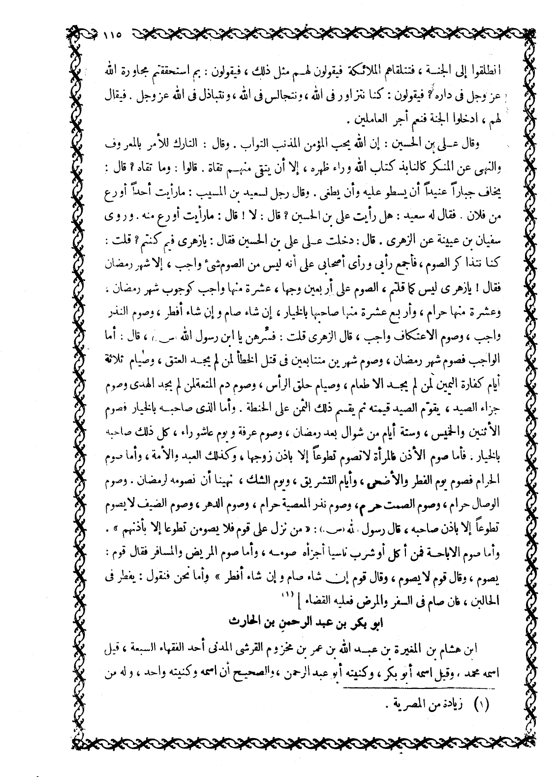 كنا نتذاكر الصوم، فأجمع رأيي ورأى أصحابى على أنه ليس من الصوم شيء واجب، إلا شهر رمضان فقال! يا زهري ليس كما قلتم، الصوم على أربعين وجها، عشرة منها واجب كوجوب شهر رمضان، وعشرة منها حرام، وأربع عشرة منها صاحبها بالخيار، إن شاء صام وإن شاء أفطر، وصوم النذر واجب، وصوم الاعتكاف واجب، قال الزهري قلت: فسّرهن يا ابْنِ رَسُولِ اللَّهِ صَلَّى اللَّهُ عَلَيْهِ وَسَلَّمَ، قَالَ: أما الواجب فصوم شهر رمضان، وصوم شهرين متتابعين في قتل الخطأ لمن لم يجد العتق، وصيام ثلاثة أيام كفارة اليمين لمن لم يجد الإطعام، وصيام حلق الرأس، وصوم دم المتعة لمن لم يجد الهدى وصوم جزاء الصيد، يقوّم الصيد قيمته ثم يقسم ذلك الثمن على الحنطة. وأما الّذي صاحبه بالخيار فصوم الإثنين والخميس، وستة أيام من شوال بعد رمضان، وصوم عرفة ويوم عاشوراء، كل ذلك صاحبه بالخيار. فأما صوم الأذن فالمرأة لا تصوم تطوعا إلا باذن زوجها، وكذلك العبد والأمة، وأما صوم الحرام فصوم يوم الفطر والأضحى، وأيام التشريق، ويوم الشك، نهينا أن نصومه لرمضان. وصوم الوصال حرام، وصوم الصمت حرام، وصوم نذر المعصية حرام، وصوم الدهر، وصوم الضيف لا يصوم تطوعا إلا باذن صاحبه، قَالَ رَسُولُ اللَّهِ صَلَّى اللَّهُ عَلَيْهِ وَسَلَّمَ: «من نزل على قوم لا يصومن تطوعا إلا بأذنهم» .