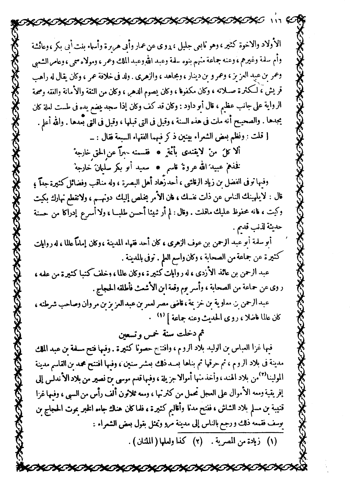 الْأَوْلَادِ وَالْإِخْوَةِ كَثِيرٌ، وَهُوَ تَابِعِيٌّ جَلِيلٌ، رَوَى عَنْ عَمَّارٍ وَأَبِي هُرَيْرَةَ وَأَسْمَاءَ بِنْتِ أَبِي بَكْرٍ، وَعَائِشَةَ وَأُمِّ سَلَمَةَ وَغَيْرِهِمْ، وَعَنْهُ جَمَاعَةٌ مِنْهُمْ بَنُوهُ سَلَمَةُ وَعَبْدُ اللَّهِ وَعَبْدُ الْمَلِكِ وَعُمَرُ، وَمَوْلَاهُ سُمَيٌّ، وَعَامِرٌ الشَّعْبِيُّ وَعُمَرُ بْنُ عَبْدِ الْعَزِيزِ، وَعَمْرُو بْنُ دِينَارٍ، وَمُجَاهِدٌ، وَالزُّهْرِيُّ. وُلِدَ فِي خِلَافَةِ عُمَرَ، وَكَانَ يُقَالُ لَهُ رَاهِبُ قُرَيْشٍ، لِكَثْرَةِ صَلَاتِهِ، وَكَانَ مَكْفُوفًا، وَكَانَ يَصُومُ الدَّهْرَ، وَكَانَ مِنَ الثِّقَةِ وَالْأَمَانَةِ وَالْفِقْهِ وصحة الرواية على جانب عظيم، قَالَ أَبُو دَاوُدَ: وَكَانَ قَدْ كُفَّ وَكَانَ إِذَا سَجَدَ يَضَعُ يَدَهُ فِي طَسْتٍ لِعِلَّةٍ كَانَ يَجِدُهَا. وَالصَّحِيحُ أَنَّهُ مَاتَ فِي هَذِهِ السَّنَةِ، وَقِيلَ فِي الَّتِي قَبْلَهَا، وَقِيلَ فِي التي بعدها. والله أعلم.