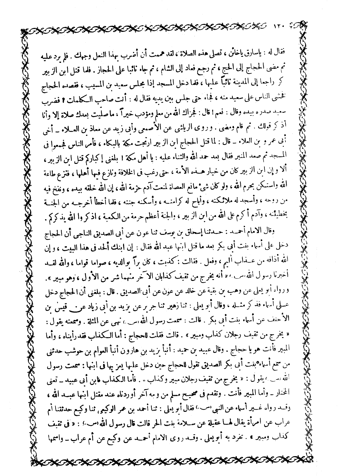 وَقَالَ الْإِمَامُ أَحْمَدُ: حَدَّثَنَا إِسْحَاقُ بْنُ يُوسُفَ ثنا عون عَنْ أَبِي الصِّدِّيقِ النَّاجِيِّ أَنَّ الْحَجَّاجَ دَخَلَ على أسماء بنت أبى بكر بعد ما قَتَلَ ابْنَهَا عَبْدَ اللَّهِ فَقَالَ: إِنَّ ابْنَكِ أَلْحَدَ فِي هَذَا الْبَيْتِ، وَإِنَّ اللَّهَ أَذَاقَهُ مِنْ عَذَابٍ أَلِيمٍ، وَفَعَلَ. فَقَالَتْ: كَذَبْتَ، كَانَ بَرًّا بِوَالِدَيْهِ، صَوَّامًا قَوَّامًا، وَاللَّهِ لَقَدْ أَخْبَرَنَا رَسُولِ اللَّهِ صَلَّى اللَّهُ عَلَيْهِ وَسَلَّمَ «أَنَّهُ يَخْرُجُ مِنْ ثَقِيفٍ كَذَّابَانِ الْآخِرُ مِنْهُمَا شَرٌّ مِنَ الْأَوَّلِ، وَهُوَ مُبِيرٌ» .