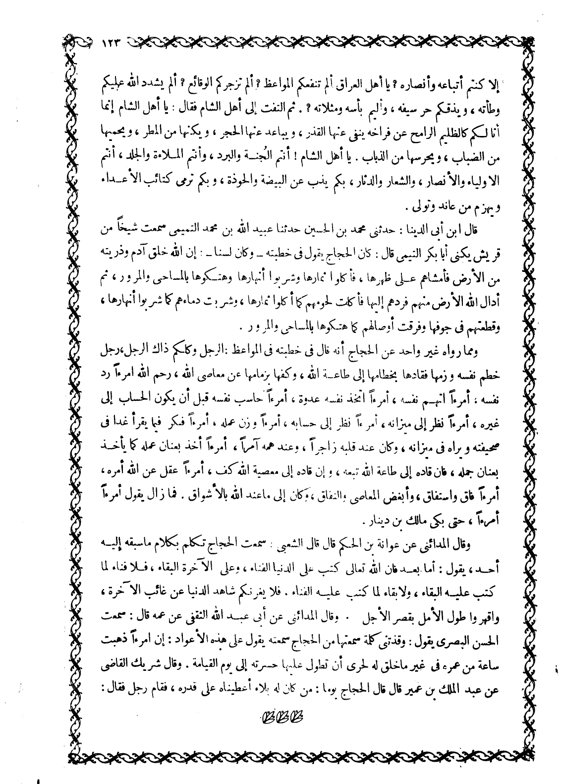 [وَقَالَ الْمَدَائِنِيُّ عَنْ عَوَانَةَ بْنِ الْحَكَمِ قَالَ قَالَ الشَّعْبِيُّ: سَمِعْتُ الْحَجَّاجَ تَكَلَّمَ بِكَلَامٍ مَا سَبَقَهُ إِلَيْهِ أَحَدٌ، يَقُولُ: أَمَّا بَعْدُ فَإِنَّ اللَّهَ تَعَالَى كَتَبَ عَلَى الدُّنْيَا الْفَنَاءَ، وَعَلَى الْآخِرَةِ الْبَقَاءَ، فَلَا فَنَاءَ لِمَا كُتِبَ عَلَيْهِ الْبَقَاءُ، وَلَا بَقَاءَ لِمَا كُتِبَ عَلَيْهِ الْفَنَاءُ، فَلَا يَغُرَنَّكُمْ شَاهِدُ الدُّنْيَا عَنْ غَائِبِ الْآخِرَةِ، وَاقْهَرُوا طُولَ الْأَمَلِ بِقِصَرِ الْأَجَلِ] [1] وَقَالَ الْمَدَائِنِيُّ عَنْ أَبِي عَبْدِ اللَّهِ الثَّقَفِيِّ عَنْ عَمِّهِ قَالَ: سَمِعْتُ الْحَسَنَ الْبَصْرِيَّ يَقُولُ: وَقَذَتْنِي كَلِمَةٌ سَمِعْتُهَا مِنَ الْحَجَّاجِ سَمِعْتُهُ يَقُولُ عَلَى هَذِهِ الْأَعْوَادِ: إِنَّ امْرَأً ذَهَبَتْ سَاعَةٌ مِنْ عُمْرِهِ فِي غَيْرِ مَا خُلِقَ لَهُ لَحَرِيٌّ أَنْ تَطُولَ عَلَيْهَا حَسْرَتُهُ إِلَى يَوْمِ الْقِيَامَةِ. وَقَالَ شَرِيكٌ الْقَاضِي عَنْ عَبْدِ الْمَلِكِ بْنِ عُمَيْرٍ قَالَ قَالَ الْحَجَّاجُ يَوْمًا: مَنْ كَانَ لَهُ بَلَاءٌ أعطيناه على قدره، فقام رجل فقال:
