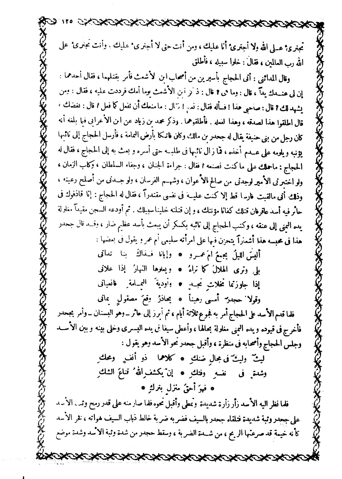 إِنَّ لِي عِنْدَكَ يَدًا، قَالَ: وَمَا هِيَ؟ قَالَ: ذَكَرَ ابْنُ الْأَشْعَثِ يَوْمًا أُمَّكَ فَرَدَدْتُ عَلَيْهِ، فَقَالَ: وَمَنْ يَشْهَدُ لَكَ؟ قَالَ: صَاحِبِي هَذَا! فَسَأَلَهُ فَقَالَ: نَعَمْ! فَقَالَ: مَا مَنَعَكَ أَنْ تَفْعَلَ كَمَا فَعَلَ؟ قَالَ: بُغْضُكَ، قَالَ أَطْلِقُوا هَذَا لِصِدْقِهِ، وهذا لفعله. فأطلقوهما. وذكر محمد بن زياد عن ابن الْأَعْرَابِيِّ فِيمَا بَلَغَهُ أَنَّهُ كَانَ رَجُلٌ مِنْ بَنِي حَنِيفَةَ يُقَالُ لَهُ جَحْدَرُ بْنُ مَالِكٍ وَكَانَ فَاتِكًا بِأَرْضِ الْيَمَامَةِ، فَأَرْسَلَ الْحَجَّاجُ إِلَى نَائِبِهَا يُؤَنِّبُهُ وَيَلُومُهُ عَلَى عَدَمِ أَخْذِهِ، فَمَا زَالَ نَائِبُهَا فِي طَلَبِهِ حَتَّى أَسَرَهُ وَبَعَثَ بِهِ إِلَى الْحَجَّاجِ، فَقَالَ لَهُ الْحَجَّاجُ: مَا حَمَلَكَ عَلَى مَا كُنْتَ تَصْنَعُهُ؟ فَقَالَ: جَرَاءَةُ الْجَنَانِ، وَجَفَاءُ السُّلْطَانِ، وَكَلْبُ الزَّمَانِ، وَلَوِ اخْتَبَرَنِي الأمير لوجدني من صالح الأعوان، وشهم الْفُرْسَانِ، وَلَوَجَدَنِي مِنْ أَصْلَحِ رَعِيَّتِهِ، وَذَلِكَ أَنِّي مَا لَقِيتُ فَارِسًا قَطُّ إِلَّا كُنْتُ عَلَيْهِ فِي نَفْسِي مُقْتَدِرًا، فَقَالَ لَهُ الْحَجَّاجُ: إِنَّا قَاذِفُوكَ فِي حَائِرٍ فِيهِ أَسَدٌ عَاقِرٌ فَإِنْ قَتَلَكَ كَفَانَا مُؤْنَتَكَ، وَإِنْ قَتَلْتَهُ خَلَّيْنَا سَبِيلَكَ. ثُمَّ أَوْدَعَهُ السِّجْنَ مُقَيَّدًا مَغْلُولَةً يَدُهُ الْيُمْنَى إِلَى عُنُقِهِ، وَكَتَبَ الْحَجَّاجُ إِلَى نَائِبِهِ بِكَسْكَرَ أن يبعث بِأَسَدٍ عَظِيمٍ ضَارٍ، وَقَدْ قَالَ جَحْدَرٌ هَذَا فِي مَحْبَسِهِ هَذَا أَشْعَارًا يَتَحَزَّنُ فِيهَا عَلَى امْرَأَتِهِ سُلَيْمَى أَمِّ عَمْرٍو يَقُولُ فِي بَعْضِهَا: