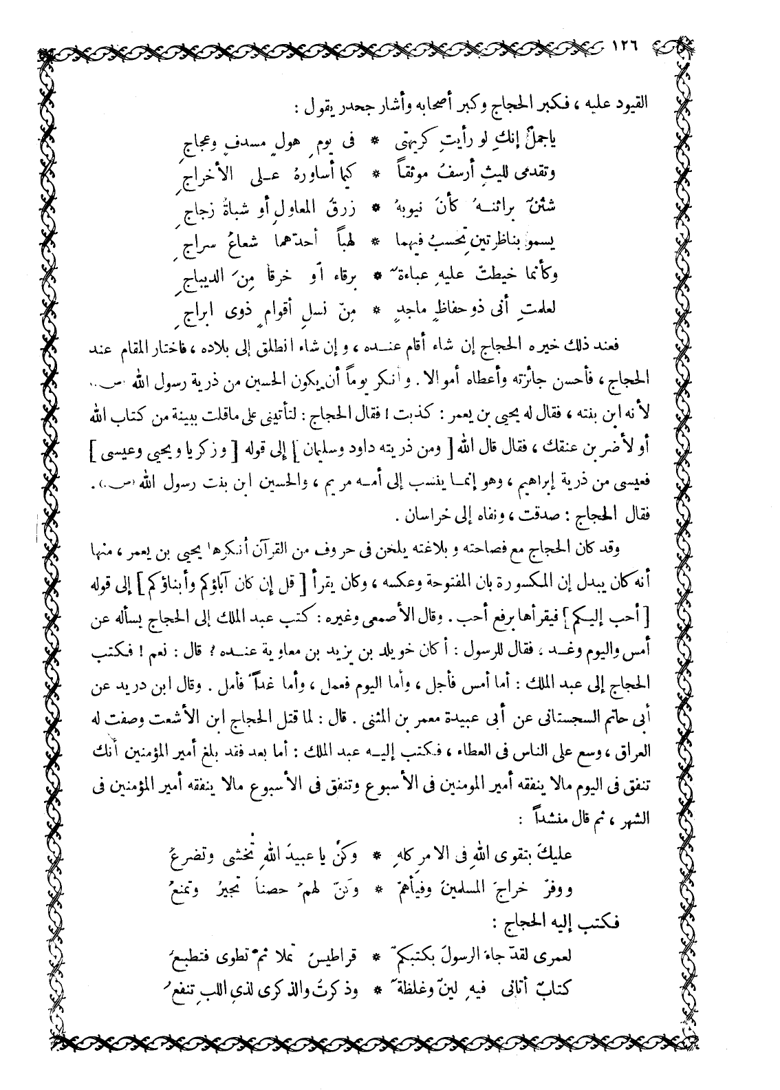 فَعِنْدَ ذَلِكَ خَيَّرَهُ الْحَجَّاجُ إِنْ شَاءَ أَقَامَ عِنْدَهُ، وَإِنْ شَاءَ انْطَلَقَ إِلَى بِلَادِهِ، فَاخْتَارَ الْمَقَامَ عِنْدَ الْحَجَّاجِ، فَأَحْسَنَ جَائِزَتَهُ وَأَعْطَاهُ أَمْوَالًا. وَأَنْكَرَ يَوْمًا أَنْ يَكُونَ الْحُسَيْنُ مِنْ ذُرِّيَّةِ رَسُولِ اللَّهِ صَلَّى اللَّهُ عَلَيْهِ وَسَلَّمَ لِأَنَّهُ ابْنَ بِنْتِهِ، فَقَالَ لَهُ يَحْيَى بْنُ يَعْمُرَ: كَذَبْتَ! فَقَالَ الْحَجَّاجُ: لَتَأْتِيَنِّي عَلَى مَا قُلْتَ بِبَيِّنَةٍ مِنْ كِتَابِ اللَّهِ أَوْ لَأَضْرِبَنَّ عُنُقَكَ، فَقَالَ قَالَ اللَّهُ وَمن ذُرِّيَّتِهِ داوُدَ وَسُلَيْمانَ 6: 84 إلى قوله وَزَكَرِيَّا وَيَحْيى وَعِيسى 6: 85 فَعِيسَى مِنْ ذُرِّيَّةِ إِبْرَاهِيمَ، وَهُوَ إِنَّمَا يُنْسَبُ إِلَى أُمِّهِ مَرْيَمَ، وَالْحُسَيْنُ ابْنُ بِنْتُ رَسُولِ اللَّهِ صَلَّى اللَّهُ عَلَيْهِ وَسَلَّمَ.