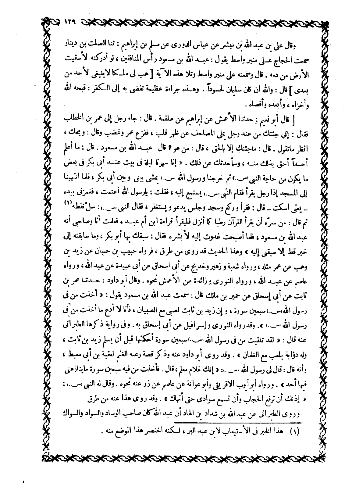 [قال أبو نعيم: حدثنا الأعمش عن إبراهيم عن علقمة. قَالَ: جَاءَ رَجُلٌ إِلَى عُمَرَ بْنِ الْخَطَّابِ فقال: إني جئتك من عند رجل يملى المصاحف عن ظهر قلب، ففزع عمرو غضب وقال: ويحك، انظر ما تقول. قال: ما جئتك إلا بالحق، قال: من هو؟ قال: عبد الله بن مسعود. قال: ما أعلم أحدا أحق بذلك منه، وسأحدثك عن ذلك. «إنا سهرنا ليلة في بيت عند أبى بكر في بعض ما يكون من حاجة النبي صلى الله عليه وسلم ثم خرجنا وَرَسُولُ اللَّهِ صَلَّى اللَّهُ عَلَيْهِ وَسَلَّمَ يَمْشِي بيني وبين أبى بكر، فلما انتهينا إلى المسجد إذا رجل يقرأ فقام النبي صلى الله عليه وسلم يستمع إليه، فقلت: يا رسول الله أعتمت، فغمزني بيده- يعنى اسكت- قال: فقرأ وركع وسجد وجلس يدعو ويستغفر، فقال النبي صلى الله عليه وسلم: سلّ نفطه [1] ثم قال: من سرّه أن يقرأ القرآن رطبا كما أنزل فليقرأ قراءة ابن أم عبد، فعلمت أنا وصاحبي أنه عبد الله بن مسعود، فلما أصبحت غدوت إليه لأبشره فقال: سبقك بها أبو بكر، وما سابقته إلى خير قط إلا سبقني إليه» وهذا الحديث قد روى من طرق، فرواه حبيب بن حسان عن زيد بن وهب عن عمر مثله، ورواه شعبة وزهير وخديج عَنْ أَبِي إِسْحَاقَ عَنْ أَبِي عُبَيْدَةَ عَنْ عبد الله، ورواه عاصم عن عبد الله، ورواه الثوري وزائدة عن الأعمش نحوه. وقال أبو داود: حدثنا عمر بن ثابت عن أبى إسحاق عن حمير بن مالك قال: سمعت عبد الله بن مسعود يقول: «أخذت مِنْ فِي رَسُولِ اللَّهِ صَلَّى اللَّهُ عَلَيْهِ وَسَلَّمَ سبعين سورة، وإن زيد بن ثابت لصبي مع الصبيان، فأنا لا أدع ما أخذت مِنْ فِي رَسُولِ اللَّهِ صَلَّى اللَّهُ عَلَيْهِ وَسَلَّمَ» . وَقَدْ رواه الثوري وإسرافيل عن أبى إسحاق به. وفي رواية ذكرها الطبراني عنه قال: «لقد تلقيت مِنْ فِي رَسُولِ اللَّهِ صَلَّى اللَّهُ عَلَيْهِ وَسَلَّمَ سبعين سورة أحكمتها قبل أن يسلم زيد بن ثابت، وله ذؤابة يلعب مع الغلمان» . وقد روى أبو داود عنه وذكر قصة رعيه الغنم لعقبة بن أبى معيط، وأنه قَالَ: قَالَ لِي رَسُولُ اللَّهِ صَلَّى اللَّهُ عَلَيْهِ وسلم: «إنك غلام معلم، قال: فَأَخَذْتُ مِنْ فِيهِ سَبْعِينَ سُورَةً مَا يُنَازِعُنِي فيها أحد» . ورواه أبو أيوب الإفريقي وأبو عوانة عن عاصم عن زر عنه نحوه. وقال له النبي صلى الله عليه وسلم: «إذنك أن ترفع الحجاب وأن تسمع سوادي حتى أنهاك» . وقد روى هذا عنه من طرق.