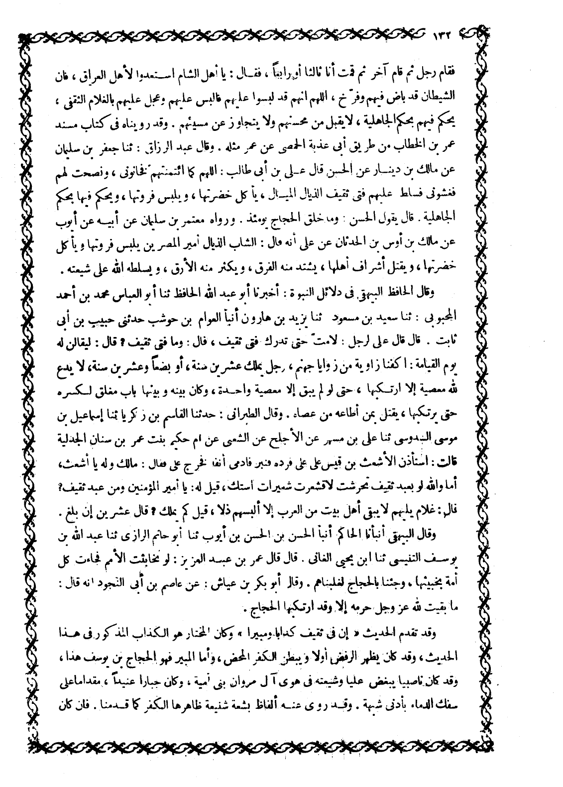 فَقَامَ رَجُلٌ ثُمَّ قَامَ آخَرُ ثُمَّ قُمْتُ أَنَا ثَالِثًا أَوْ رَابِعًا، فَقَالَ: يَا أَهْلَ الشَّامِ اسْتَعِدُّوا لِأَهْلِ الْعِرَاقِ، فَإِنَّ الشَّيْطَانَ قَدْ بَاضَ فِيهِمْ وَفَرَّخَ، اللَّهمّ إِنَّهُمْ قَدْ لَبِسُوا عَلَيْهِمْ فَأَلْبِسْ عَلَيْهِمْ وَعَجِّلْ عَلَيْهِمْ بِالْغُلَامِ الثَّقَفِيِّ، يَحْكُمُ فِيهِمْ بِحُكْمِ الْجَاهِلِيَّةِ، لَا يَقْبَلُ مِنْ مُحْسِنِهِمْ وَلَا يَتَجَاوَزُ عَنْ مُسِيئِهِمْ. وَقَدْ رَوَيْنَاهُ فِي كِتَابِ مُسْنَدِ عُمَرَ بْنِ الْخَطَّابِ مِنْ طَرِيقِ أَبِي عَذْبَةَ الْحِمَّصِيِّ عَنْ عُمَرَ مِثْلَهُ. وقال عبد الرزاق: ثنا جَعْفَرُ بْنُ سُلَيْمَانَ عَنْ مَالِكِ بْنِ دِينَارٍ عَنِ الْحَسَنِ قَالَ عَلِيُّ بْنُ أَبِي طَالِبٍ: اللَّهمّ كَمَا ائْتَمَنْتُهُمْ فَخَانُونِي، وَنَصَحْتُ لَهُمْ فَغَشُّونِي فَسَلِّطْ عَلَيْهِمْ فَتَى ثَقِيفٍ الذَّيَّالَ الْمَيَّالَ، يَأْكُلُ خَضِرَتَهَا، وَيَلْبَسُ فَرْوَتَهَا، وَيَحْكُمُ فِيهَا بِحُكْمِ الْجَاهِلِيَّةِ. قَالَ يَقُولُ الْحَسَنُ: وَمَا خُلِقَ الْحَجَّاجُ يَوْمَئِذٍ. وَرَوَاهُ مُعْتَمِرِ بْنِ سُلَيْمَانَ عَنْ أَبِيهِ عَنْ أَيُّوبَ عَنْ مَالِكِ بْنِ أَوْسِ بْنِ الْحَدَثَانِ عَنْ عَلِيٍّ أَنَّهُ قَالَ: الشَّابُّ الذَّيَّالُ أَمِيرُ الْمِصْرَيْنِ يَلْبَسُ فَرْوَتَهَا وَيَأْكُلُ خَضِرَتَهَا، وَيَقْتُلُ أَشْرَافَ أَهْلِهَا، يَشْتَدُّ مِنْهُ الْفَرَقُ، وَيَكْثُرُ مِنْهُ الْأَرَقُ، وَيُسَلِّطُهُ اللَّهُ عَلَى شِيعَتِهِ. وَقَالَ الْحَافِظُ الْبَيْهَقِيُّ فِي دَلَائِلِ النُّبُوَّةِ: أَخْبَرَنَا أَبُو عَبْدِ اللَّهِ الْحَافِظُ ثَنَا أَبُو الْعَبَّاسِ مُحَمَّدُ بْنُ أَحْمَدَ الْمَحْبُوبِيُّ: ثَنَا سَعِيدُ بْنُ مَسْعُودٍ: ثَنَا يَزِيدُ بْنُ هَارُونَ أَنْبَأَ الْعَوَّامُ بْنُ حَوْشَبٍ حَدَّثَنِي حَبِيبُ بْنُ أَبِي ثَابِتٍ. قَالَ قَالَ عَلِيٌّ لِرَجُلٍ: لَا مِتَّ حتى تدرك فتى ثقيف، قال: وَمَا فَتَى ثَقِيفٍ؟ قَالَ: لَيُقَالَنَّ لَهُ يَوْمَ الْقِيَامَةِ: اكْفِنَا زَاوِيَةً مِنْ زَوَايَا جَهَنَّمَ، رَجُلٌ يَمْلِكُ عِشْرِينَ سَنَةً، أَوْ بِضْعًا وَعِشْرِينَ سَنَةً، لَا يَدْعُ للَّه مَعْصِيَةً إِلَّا ارْتَكَبَهَا، حَتَّى لَوْ لَمْ يَبْقَ إِلَّا مَعْصِيَةٌ وَاحِدَةٌ، وَكَانَ بَيْنَهُ وَبَيْنَهَا بَابٌ مُغْلِقٌ لَكَسَرَهُ حَتَّى يَرْتَكِبَهَا، يَقْتُلُ بِمَنْ أَطَاعَهُ مَنْ عَصَاهُ. وَقَالَ الطَّبَرَانِيُّ: حَدَّثَنَا الْقَاسِمُ بْنُ زكريا ثنا إسماعيل بن موسى السدوسي ثَنَا عَلِيُّ بْنُ مُسْهِرٍ عَنِ الْأَجْلَحِ عَنِ الشَّعْبِيِّ عَنْ أُمِّ حَكِيمٍ بِنْتِ عُمَرَ بْنِ سِنَانٍ الْجَدَلِيَّةِ قَالَتْ: اسْتَأْذَنَ الْأَشْعَثُ بْنُ قَيْسٍ عَلَى عَلِيٍّ فَرَدَّهُ قُنْبُرٌ فَأَدْمَى أَنْفَهُ فَخَرَجَ عَلِيٌّ فَقَالَ: مَا لَكَ وَلَهُ يَا أَشْعَثُ، أما والله لو بعبد ثقيف تحرشت لَاقْشَعَرَّتْ شُعَيْرَاتُ اسْتِكَ، قِيلَ لَهُ: يَا أَمِيرَ الْمُؤْمِنِينَ وَمَنْ عَبْدُ ثَقِيفٍ؟