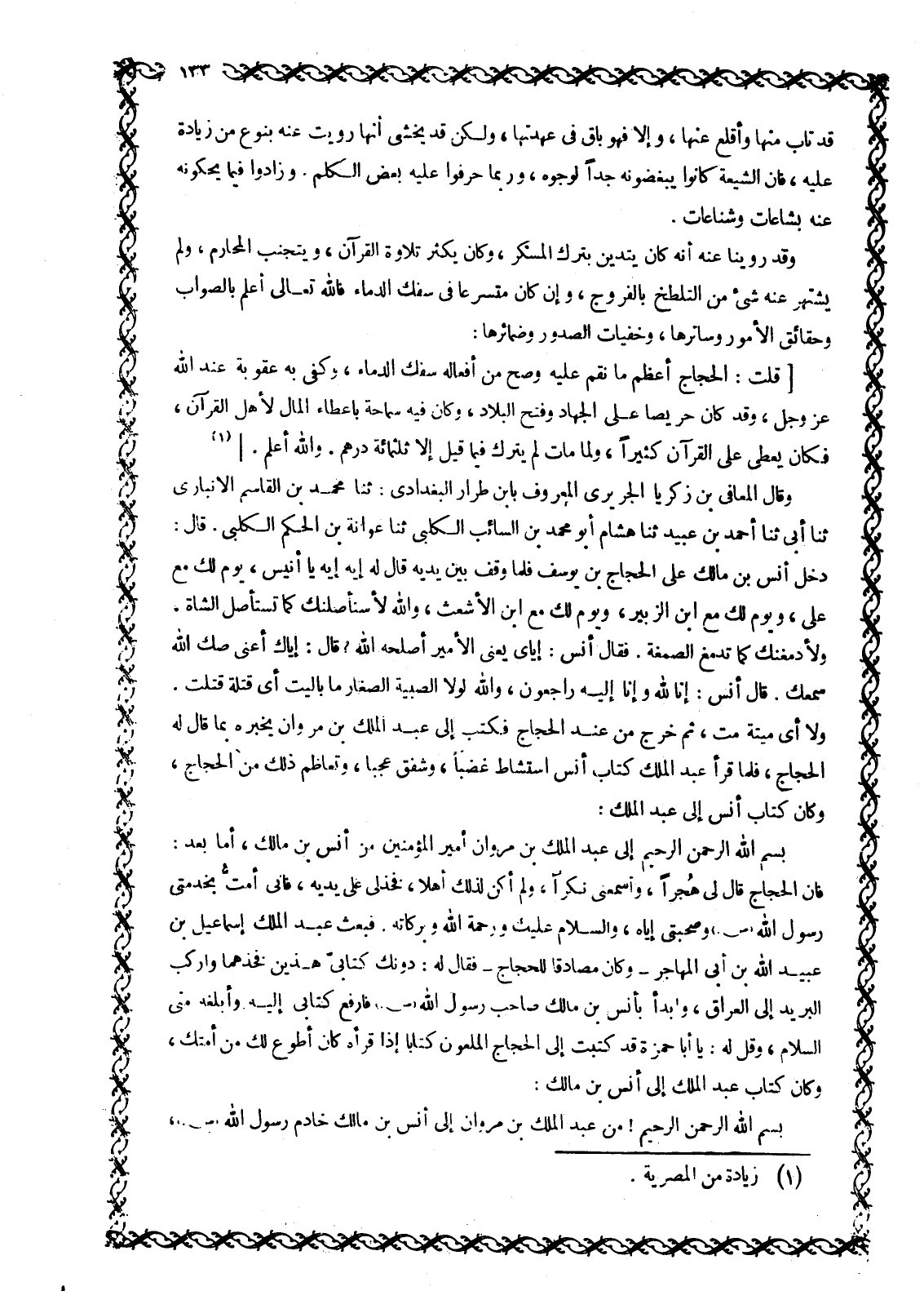 فَإِنَّ الْحَجَّاجَ قَالَ لِي هُجْرًا، وَأَسْمَعَنِي نُكْرًا، وَلَمْ أَكُنْ لِذَلِكَ أَهْلًا، فَخُذْ لِي عَلَى يَدَيْهِ، فَإِنِّي أَمُتُّ بِخِدْمَتِي رَسُولَ اللَّهِ صَلَّى اللَّهُ عَلَيْهِ وَسَلَّمَ وَصُحْبَتِي إِيَّاهُ، وَالسَّلَامُ عَلَيْكَ وَرَحْمَةُ اللَّهِ وَبَرَكَاتُهُ. فَبَعَثَ عبد الملك إسماعيل بن عبيد الله بن أبي المهاجر- وَكَانَ مُصَادِقًا لِلْحَجَّاجِ- فَقَالَ لَهُ: دُونَكَ كِتَابَيَّ هَذَيْنِ فَخُذْهُمَا وَارْكَبِ الْبَرِيدَ إِلَى الْعِرَاقِ، وَابْدَأْ بِأَنَسِ بْنِ مَالِكٍ صَاحِبَ رَسُولِ اللَّهِ صَلَّى اللَّهُ عَلَيْهِ وَسَلَّمَ فارفع كِتَابِي إِلَيْهِ وَأَبْلِغْهُ مِنِّي السَّلَامَ، وَقُلْ لَهُ: يَا أَبَا حَمْزَةَ قَدْ كَتَبْتُ إِلَى الْحَجَّاجِ الْمَلْعُونِ كِتَابًا إِذَا قَرَأَهُ كَانَ أَطْوَعَ لَكَ مِنْ أَمَتِكَ، وَكَانَ كِتَابُ عَبْدِ الْمَلِكِ إِلَى أَنَسِ بْنِ مَالِكٍ: