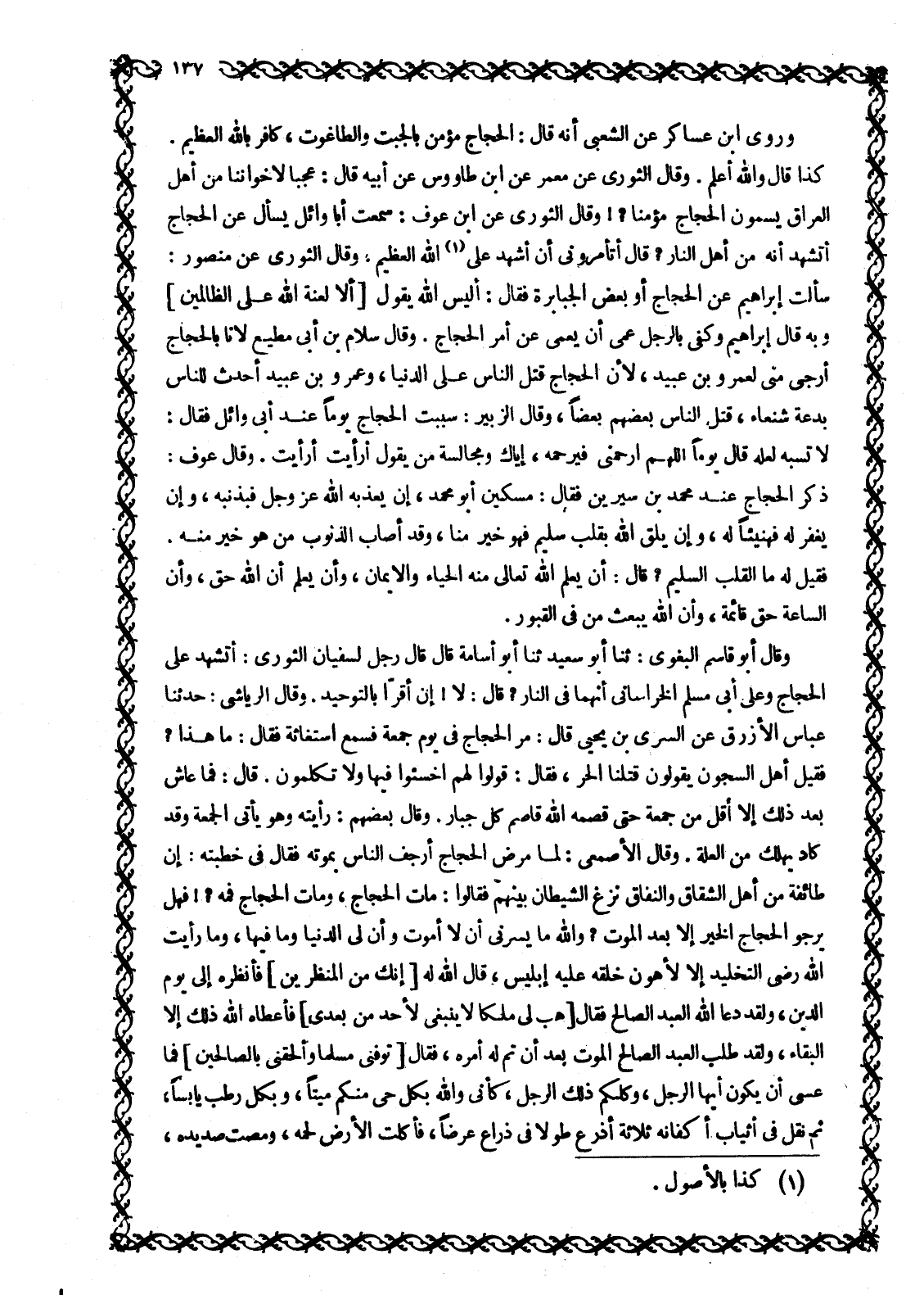 كَذَا قَالَ وَاللَّهُ أَعْلَمُ. وَقَالَ الثَّوْرِيُّ عَنْ معمر عن ابن طاووس عَنْ أَبِيهِ قَالَ: عَجَبًا لِإِخْوَانِنَا مِنْ أَهْلِ الْعِرَاقِ يُسَمُّونَ الْحَجَّاجَ مُؤْمِنًا؟! وَقَالَ الثَّوْرِيُّ عَنِ ابن عوف: سَمِعْتُ أَبَا وَائِلٍ يُسْأَلُ عَنِ الْحَجَّاجِ أَتَشْهَدُ أَنَّهُ مِنْ أَهْلِ النَّارِ؟ قَالَ أَتَأْمُرُونِي أَنْ أَشْهَدَ عَلَى [1] اللَّهِ الْعَظِيمِ، وَقَالَ الثَّوْرِيُّ عَنْ منصور: