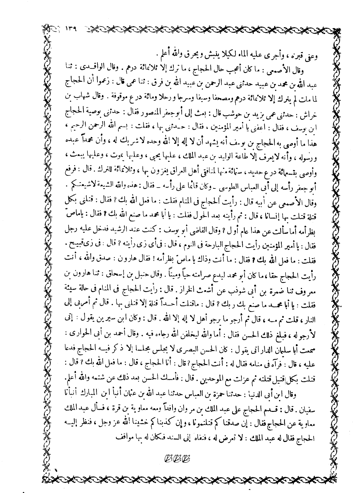 فقلت: مَا فَعَلَ اللَّهُ بِكَ؟ فَقَالَ: مَا أَنْتَ وَذَاكَ يَا مَاصَّ بَظْرِ أُمِّهِ! فَقَالَ هَارُونُ: صدق وَاللَّهِ، أَنْتَ رَأَيْتَ الْحَجَّاجَ حَقًّا، مَا كَانَ أَبُو مُحَمَّدٍ لِيَدَعَ صَرَامَتَهُ حَيًّا وَمَيِّتًا. وَقَالَ حَنْبَلُ بْنُ إِسْحَاقَ: ثَنَا هَارُونُ بْنُ مَعْرُوفٍ ثنا ضمرة بن أبى شوذب عن أشعث الخراز. قَالَ: رَأَيْتُ الْحَجَّاجَ فِي الْمَنَامِ فِي حَالَةٍ سَيِّئَةٍ فَقُلْتُ: يَا أَبَا مُحَمَّدٍ مَا صَنَعَ بِكَ رَبُّكَ؟ قَالَ: مَا قَتَلْتُ أَحَدًا قِتْلَةً إلا قتلني بها. قَالَ ثُمَّ أَمَرَ بِي إِلَى النَّارِ، قُلْتُ ثُمَّ مَهْ، قَالَ ثُمَّ أَرْجُو مَا يَرْجُو أَهْلُ لَا إِلَهَ إِلَّا اللَّهُ. قَالَ: وَكَانَ ابْنُ سِيرِينَ يَقُولُ: إِنِّي لَأَرْجُو لَهُ، فَبَلَغَ ذَلِكَ الْحَسَنَ فَقَالَ: أَمَا وَاللَّهِ لَيُخْلِفَنَّ اللَّهُ رَجَاءَهُ فِيهِ. وَقَالَ أَحْمَدُ بْنُ أَبِي الْحَوَارِيِّ: