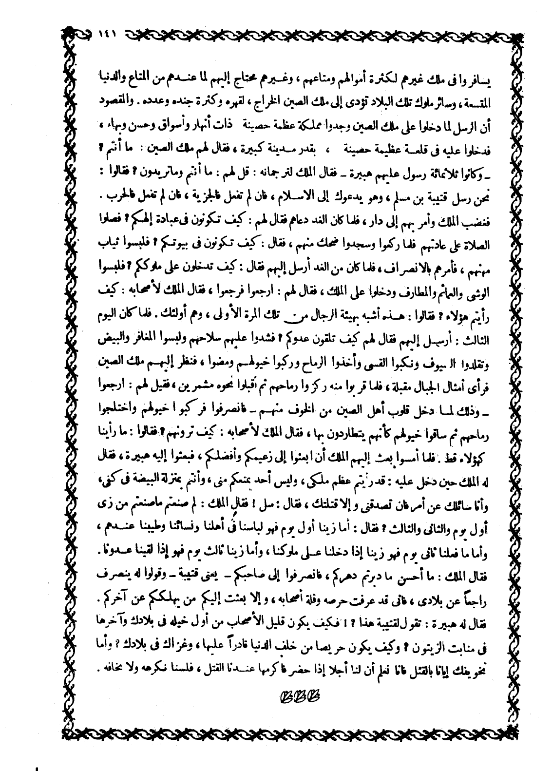 فَغَضِبَ الْمَلِكُ وَأَمَرَ بِهِمْ إِلَى دَارٍ، فَلَمَّا كَانَ الْغَدُ دَعَاهُمْ فَقَالَ لَهُمْ: كَيْفَ تَكُونُونَ فِي عِبَادَةِ إِلَهِكُمْ؟ فَصَلَّوُا الصَّلَاةَ عَلَى عَادَتِهِمْ فَلَمَّا رَكَعُوا وَسَجَدُوا ضَحِكَ مِنْهُمْ، فَقَالَ: كَيْفَ تَكُونُونَ فِي بُيُوتِكُمْ؟ فَلَبِسُوا ثِيَابَ مِهَنِهِمْ، فَأَمَرَهُمْ بِالِانْصِرَافِ، فَلَمَّا كَانَ مِنَ الْغَدِ أَرْسَلَ إِلَيْهِمْ فَقَالَ: كَيْفَ تَدْخُلُونَ عَلَى مُلُوكِكُمْ؟ فَلَبِسُوا الْوَشْيَ وَالْعَمَائِمَ وَالْمَطَارِفَ وَدَخَلُوا عَلَى الْمَلِكِ، فَقَالَ لَهُمْ: ارْجِعُوا فَرَجَعُوا، فَقَالَ الْمَلِكُ لِأَصْحَابِهِ: كَيْفَ رَأَيْتُمْ هَؤُلَاءِ؟ فَقَالُوا: هَذِهِ أَشْبَهُ بِهَيْئَةِ الرِّجَالِ مِنْ تِلْكَ الْمَرَّةِ الْأُولَى، وَهُمْ أُولَئِكَ. فَلَمَّا كَانَ الْيَوْمُ الثَّالِثُ: أَرْسَلَ إِلَيْهِمْ فَقَالَ لَهُمْ كَيْفَ تَلْقَوْنَ عَدُوَّكُمْ؟ فَشَدُّوا عَلَيْهِمْ سِلَاحَهُمْ وَلَبِسُوا الْمَغَافِرَ وَالْبَيْضَ وَتَقَلَّدُوا السُّيُوفَ ونكبوا الْقِسِيَّ وَأَخَذُوا الرِّمَاحَ وَرَكِبُوا خُيُولَهُمْ وَمَضَوْا، فَنَظَرَ إِلَيْهِمْ مَلِكُ الصِّينِ فَرَأَى أَمْثَالَ الْجِبَالِ مُقْبِلَةً، فَلَمَّا قَرُبُوا مِنْهُ رَكَزُوا رِمَاحَهُمْ ثُمَّ أَقْبَلُوا نَحْوَهُ مُشَمِّرِينَ، فَقِيلَ لَهُمْ: ارْجِعُوا- وَذَلِكَ لِمَا دَخَلَ قُلُوبَ أَهْلِ الصِّينِ مِنَ الْخَوْفِ مِنْهُمْ- فَانْصَرَفُوا فَرَكِبُوا خُيُولَهُمْ وَاخْتَلَجُوا رِمَاحَهُمْ ثُمَّ سَاقُوا خُيُولَهُمْ كَأَنَّهُمْ يَتَطَارَدُونَ بِهَا، فَقَالَ الْمَلِكُ لِأَصْحَابِهِ: كيف ترونهم؟ فقالوا: ما رأينا كهؤلاء قَطُّ. فَلَمَّا أَمْسَوْا بَعَثَ إِلَيْهِمُ الْمَلِكُ أَنِ ابْعَثُوا إِلَيَّ زَعِيمَكُمْ وَأَفْضَلَكُمْ، فَبَعَثُوا إِلَيْهِ هُبَيْرَةَ، فَقَالَ لَهُ الْمَلِكُ حِينَ دَخَلَ عَلَيْهِ: قَدْ رَأَيْتُمْ عِظَمَ مُلْكِي، وَلَيْسَ أَحَدٌ يَمْنَعُكُمْ مِنِّي، وَأَنْتُمْ بِمَنْزِلَةِ الْبَيْضَةِ فِي كَفِّي، وَأَنَا سَائِلُكُ عن أمر فان تصدقني وإلا قَتَلْتُكَ، فَقَالَ: سَلْ! فَقَالَ الْمَلِكُ: لِمَ صَنَعْتُمْ مَا صَنَعْتُمْ مِنْ زِيٍّ أَوَّلَ يَوْمٍ وَالثَّانِيَ وَالثَّالِثَ؟ فَقَالَ: أَمَّا زِيُّنَا أَوَّلَ يَوْمٍ فَهُوَ لِبَاسُنَا فِي أَهْلِنَا وَنِسَائِنَا وَطِيبُنَا عِنْدَهُمْ، وَأَمَّا مَا فَعَلْنَا ثَانِيَ يَوْمٍ فَهُوَ زِيُّنَا إِذَا دَخَلْنَا عَلَى مُلُوكِنَا، وَأَمَّا زِيُّنَا ثَالِثَ يَوْمٍ فَهُوَ إِذَا لَقِينَا عَدُوَّنَا.