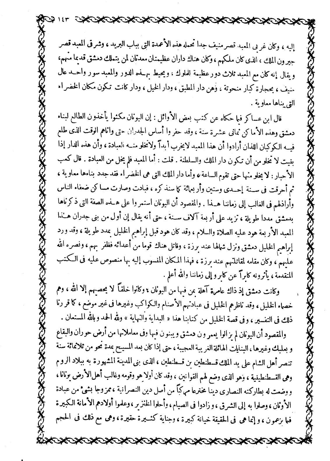 وَالْمَقْصُودُ أَنَّ الْيُونَانَ لَمْ يَزَالُوا يَعْمُرُونَ دِمَشْقَ وَيَبْنُونَ فِيهَا وَفِي مُعَامَلَاتِهَا مِنْ أَرْضِ حَوْرَانَ وَالْبِقَاعِ وَبَعْلَبَكَّ وَغَيْرِهَا، الْبِنَايَاتِ الْهَائِلَةَ الْغَرِيبَةَ الْعَجِيبَةَ، حَتَّى إِذَا كَانَ بَعْدَ الْمَسِيحِ بِمُدَّةٍ نَحْوٍ مَنْ ثَلَاثِمِائَةِ سَنَةٍ تَنَصَّرَ أَهْلُ الشَّامِ عَلَى يَدِ الْمَلِكِ قُسْطَنْطِينَ بْنِ قُسْطَنْطِينَ، الّذي بنى المدينة المشهورة به ببلاد الروم وَهِيَ الْقُسْطَنْطِينِيَّةُ، وَهُوَ الَّذِي وَضَعَ لَهُمُ الْقَوَانِينَ، وَقَدْ كَانَ أَوَّلًا هُوَ وَقَوْمُهُ وَغَالِبُ أَهْلِ الأرض يونانا، ووضعت له بطاركته النَّصَارَى دِينًا مُخْتَرَعًا مُرَكَّبًا مِنْ أَصْلِ دِينِ النَّصْرَانِيَّةِ، مَمْزُوجًا بِشَيْءٍ مِنْ عِبَادَةِ الْأَوْثَانِ، وَصَلَّوْا بِهِ إِلَى الشَّرْقِ، وَزَادُوا فِي الصِّيَامِ، وَأَحَلُّوا الْخِنْزِيرَ، وَعَلَّمُوا أَوْلَادَهُمُ الْأَمَانَةَ الْكَبِيرَةَ فِيمَا يَزْعُمُونَ، وَإِنَّمَا هِيَ فِي الْحَقِيقَةِ خِيَانَةٌ كَبِيرَةٌ، وَجِنَايَةٌ كَثِيرَةٌ حَقِيرَةٌ، وَهِيَ مَعَ ذَلِكَ فِي الْحَجْمِ