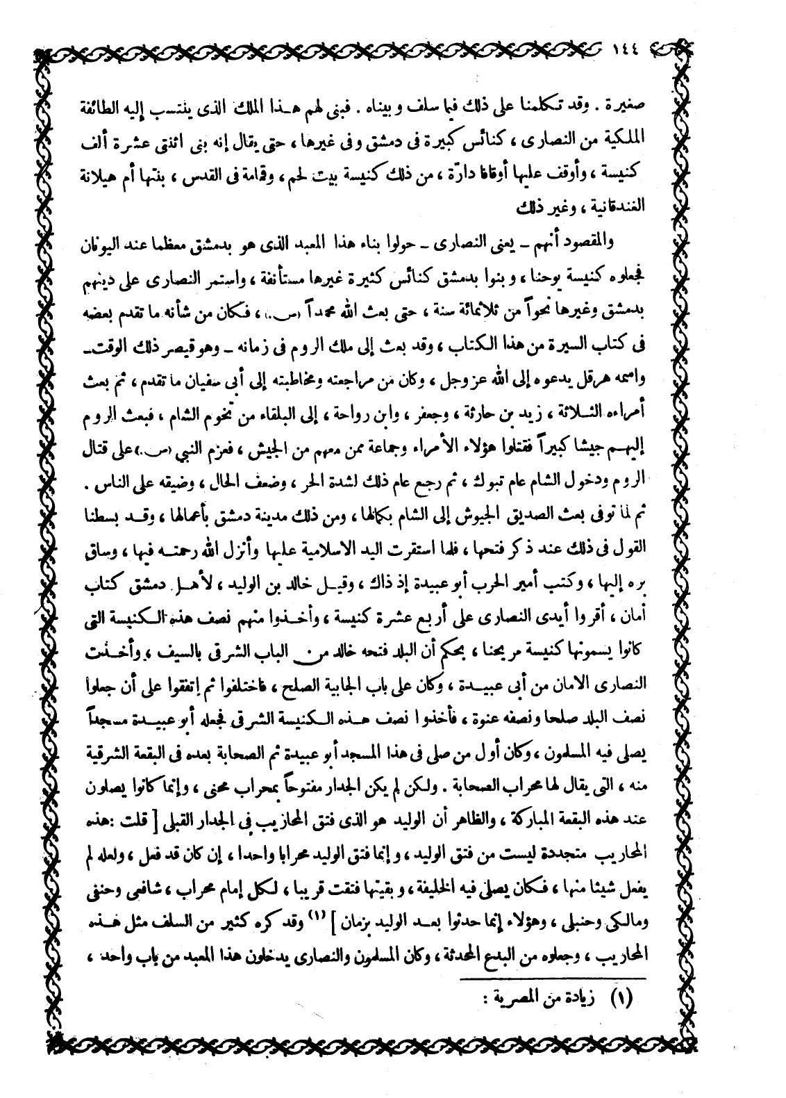 وَالْمَقْصُودُ أَنَّهُمْ- يَعْنِي النَّصَارَى- حَوَّلُوا بِنَاءَ هَذَا الْمَعْبَدِ الَّذِي هُوَ بِدِمَشْقَ مُعَظَّمًا عند اليونان فجعلوه كَنِيسَةُ يُوحَنَّا، وَبَنَوْا بِدِمَشْقَ كَنَائِسَ كَثِيرَةً غَيْرَهَا مستأنفة، واستمر النصارى على دينهم بِدِمَشْقَ وَغَيْرِهَا نَحْوًا مِنْ ثَلَاثِمِائَةِ سَنَةٍ، حَتَّى بَعَثَ اللَّهُ مُحَمَّدًا صَلَّى اللَّهُ عَلَيْهِ وَسَلَّمَ، فكان من شأنه ما تقدم بَعْضَهُ فِي كِتَابِ السِّيرَةِ مِنْ هَذَا الْكِتَابِ، وقد بعث إِلَى مَلِكِ الرُّومِ فِي زَمَانِهِ- وَهُوَ قَيْصَرُ ذَلِكَ الْوَقْتِ- وَاسْمُهُ هِرَقْلُ يَدْعُوهُ إِلَى اللَّهِ عَزَّ وَجَلَّ، وَكَانَ مِنْ مُرَاجَعَتِهِ وَمُخَاطَبَتِهِ إِلَى أبى سفيان ما تقدم، ثم بعث أمراءه الثلاثة، زيد بن حارثة، وجعفر، وابن رَوَاحَةَ، إِلَى الْبَلْقَاءِ مِنْ تُخُومِ الشَّامِ، فَبَعَثَ الروم إليهم جيشا كبيرا فَقَتَلُوا هَؤُلَاءِ الْأُمَرَاءَ وَجَمَاعَةً مِمَّنْ مَعَهُمْ مِنَ الْجَيْشِ، فَعَزَمَ النَّبِيُّ صَلَّى اللَّهُ عَلَيْهِ وَسَلَّمَ عَلَى قِتَالِ الرُّومِ وَدُخُولِ الشَّامِ عَامَ تَبُوكَ، ثم رجع عَامَ ذَلِكَ لِشِدَّةِ الْحَرِّ، وَضَعْفِ الْحَالِ، وَضِيقِهِ على الناس.