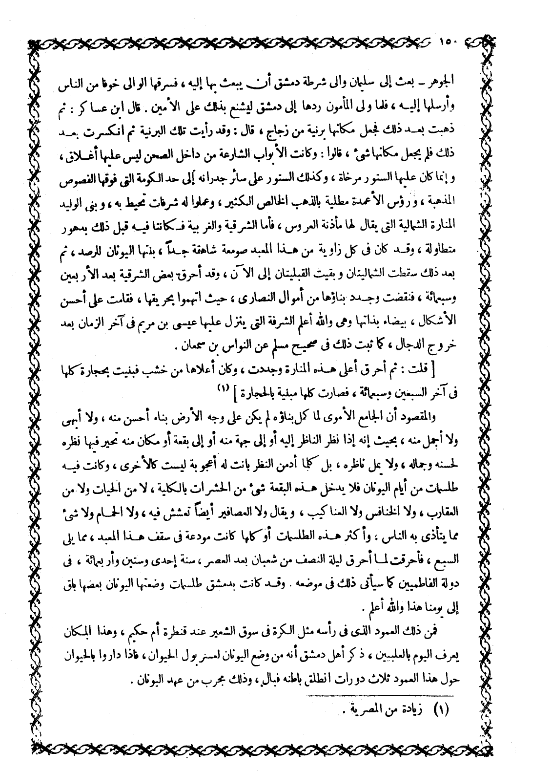 [قُلْتُ: ثُمَّ أُحْرِقَ أَعْلَى هَذِهِ الْمَنَارَةِ وَجُدِّدَتْ، وَكَانَ أَعْلَاهَا مِنْ خَشَبٍ فَبُنِيَتْ بِحِجَارَةٍ كُلُّهَا فِي آخِرِ السَّبْعِينَ وَسَبْعِمِائَةٍ، فَصَارَتْ كُلُّهَا مَبْنِيَّةً بِالْحِجَارَةِ] [1] وَالْمَقْصُودُ أَنَّ الْجَامِعَ الْأُمَوِيَّ لَمَّا كَمُلَ بِنَاؤُهُ لَمْ يَكُنْ عَلَى وَجْهِ الْأَرْضِ بِنَاءٌ أَحْسَنَ مِنْهُ، وَلَا أَبْهَى ولا أجمل مِنْهُ، بِحَيْثُ إِنَّهُ إِذَا نَظَرَ النَّاظِرُ إِلَيْهِ أو إلى جهة منه أو إلى بقعة أو مكان منه تحير فيها نظره لحسنه وجماله، وَلَا يَمَلُّ نَاظِرُهُ، بَلْ كُلَّمَا أَدْمَنَ النَّظَرَ بَانَتْ لَهُ أُعْجُوبَةٌ لَيْسَتْ كَالْأُخْرَى، وَكَانَتْ فِيهِ طِلَّسْمَاتٌ مِنْ أَيَّامِ الْيُونَانَ فَلَا يَدْخُلُ هَذِهِ الْبُقْعَةَ شَيْءٌ مِنَ الْحَشَرَاتِ بِالْكُلِّيَّةِ، لَا مِنَ الْحَيَّاتِ وَلَا مِنَ الْعَقَارِبِ، وَلَا الْخَنَافِسِ وَلَا الْعَنَاكِيبِ، وَيُقَالُ وَلَا الْعَصَافِيرُ أَيْضًا تُعَشِّشُ فِيهِ، وَلَا الْحَمَامُ وَلَا شَيْءٌ مِمَّا يَتَأَذَّى بِهِ النَّاسُ، وَأَكْثَرُ هَذِهِ الطِلَّسْمَاتِ أَوْ كُلُّهَا كَانَتْ مودعة في سقف هذا المعبد، مما يلي السبع، فأحرقت لما أحرق لَيْلَةَ النِّصْفِ مِنْ شَعْبَانَ بَعْدَ الْعَصْرِ، سَنَةَ إِحْدَى وَسِتِّينَ وَأَرْبَعِمِائَةٍ، فِي دَوْلَةِ الْفَاطِمِيِّينَ كَمَا سَيَأْتِي ذَلِكَ فِي مَوْضِعِهِ. وَقَدْ كَانَتْ بِدِمَشْقَ طِلَّسْمَاتٌ وَضَعَتْهَا الْيُونَانُ بَعْضُهَا بَاقٍ إِلَى يَوْمِنَا هَذَا وَاللَّهُ أَعْلَمُ.
