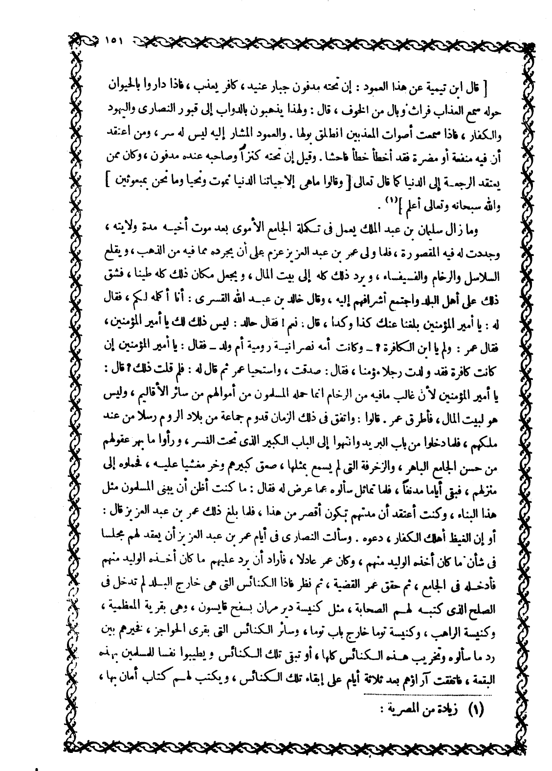أو إن الغيظ أهلك الْكُفَّارِ، دَعُوهُ. وَسَأَلَتِ النَّصَارَى فِي أَيَّامِ عُمَرَ بْنِ عَبْدِ الْعَزِيزِ أَنْ يَعْقِدَ لَهُمْ مَجْلِسًا فِي شَأْنِ مَا كَانَ أَخَذَهُ الْوَلِيدُ مِنْهُمْ، وَكَانَ عُمَرُ عَادِلًا، فَأَرَادَ أَنْ يَرُدَّ عَلَيْهِمْ مَا كَانَ أَخَذَهُ الْوَلِيدُ مِنْهُمْ فَأَدْخَلَهُ فِي الْجَامِعِ، ثُمَّ حَقَّقَ عُمَرُ الْقَضِيَّةَ، ثُمَّ نَظَرَ فَإِذَا الْكَنَائِسُ الَّتِي هِيَ خَارِجُ الْبَلَدِ لَمْ تَدْخُلْ فِي الصُّلْحِ الَّذِي كَتَبَهُ لَهُمُ الصَّحَابَةُ، مثل كنيسة دير مران بسفح قائسون، وهي بقرية المعظمية، وَكَنِيسَةِ الرَّاهِبِ، وَكَنِيسَةِ تُومَا خَارِجَ بَابِ تُومَا، وسائر الكنائس التي بقرى الحواجز، فحيرهم بَيْنَ رَدِّ مَا سَأَلُوهُ وَتَخْرِيبِ هَذِهِ الْكَنَائِسِ كُلِّهَا، أَوْ تَبْقَى تِلْكَ الْكَنَائِسُ وَيَطِيبُوا نَفْسًا لِلْمُسْلِمِينَ بِهَذِهِ الْبُقْعَةِ، فَاتَّفَقَتْ آرَاؤُهُمْ بَعْدَ ثَلَاثَةِ أَيَّامٍ عَلَى إِبْقَاءِ تِلْكَ الْكَنَائِسِ، وَيَكْتُبُ لَهُمْ كتاب أمان بها،