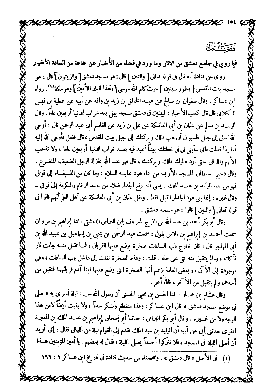 (فِيمَا رُوِيَ فِي جَامِعِ دِمَشْقَ مِنَ الْآثَارِ وَمَا وَرَدَ فِي فَضْلِهِ مِنَ الْأَخْبَارِ عَنْ جَمَاعَةٍ مِنَ السَّادَةِ الْأَخْيَارِ) رُوِيَ عَنْ قَتَادَةَ أَنَّهُ قَالَ فِي قَوْلِهِ تَعَالَى وَالتِّينِ 95: 1 قال: هو مسجد دمشق وَالزَّيْتُونِ 95: 1 قال: هو مسجد بيت المقدس وَطُورِ سِينِينَ 95: 2 حَيْثُ كَلَّمَ اللَّهُ مُوسَى وَهذَا الْبَلَدِ الْأَمِينِ 95: 3 وهو مكة [1] . رَوَاهُ ابْنُ عَسَاكِرَ. وَقَالَ صَفْوَانُ بْنُ صَالِحٍ عَنْ عَبْدِ الْخَالِقِ بْنِ زَيْدِ بْنِ وَاقَدٍ عَنْ أَبِيهِ عَنْ عَطِيَّةَ بْنِ قَيْسٍ الْكِلَابِيِّ قَالَ قَالَ كَعْبُ الْأَحْبَارِ: لَيُبْنَيَنَّ فِي دِمَشْقَ مَسْجِدٌ يَبْقَى بَعْدَ خَرَابِ الدُّنْيَا أَرْبَعِينَ عَامًا. وَقَالَ الْوَلِيدُ بْنُ مُسْلِمٍ عَنْ عُثْمَانَ بْنِ أَبِي الْعَاتِكَةِ عَنْ على بن زيد عَنِ الْقَاسِمِ أَبِي عَبْدِ الرَّحْمَنِ قَالَ: أَوْحَى اللَّهُ تَعَالَى إِلَى جَبَلِ قَاسْيُونَ أَنْ هَبْ ظِلَّكَ وَبَرَكَتَكَ إِلَى جَبَلِ بَيْتِ الْمَقْدِسِ، قَالَ ففعل فأوحى الله إليه أما إذا فعلت فانى سأبنى لي في خطتك بَيْتًا أُعْبَدُ فِيهِ بَعْدَ خَرَابِ الدُّنْيَا أَرْبَعِينَ عَامًا، وَلَا تَذْهَبُ الْأَيَّامُ وَاللَّيَالِي حَتَّى أَرُدَّ عَلَيْكَ ظِلَّكَ وَبَرَكَتَكَ، قَالَ فَهُوَ عِنْدُ اللَّهِ بِمَنْزِلَةِ الرَّجُلِ الضَّعِيفِ الْمُتَضَرِّعِ.
