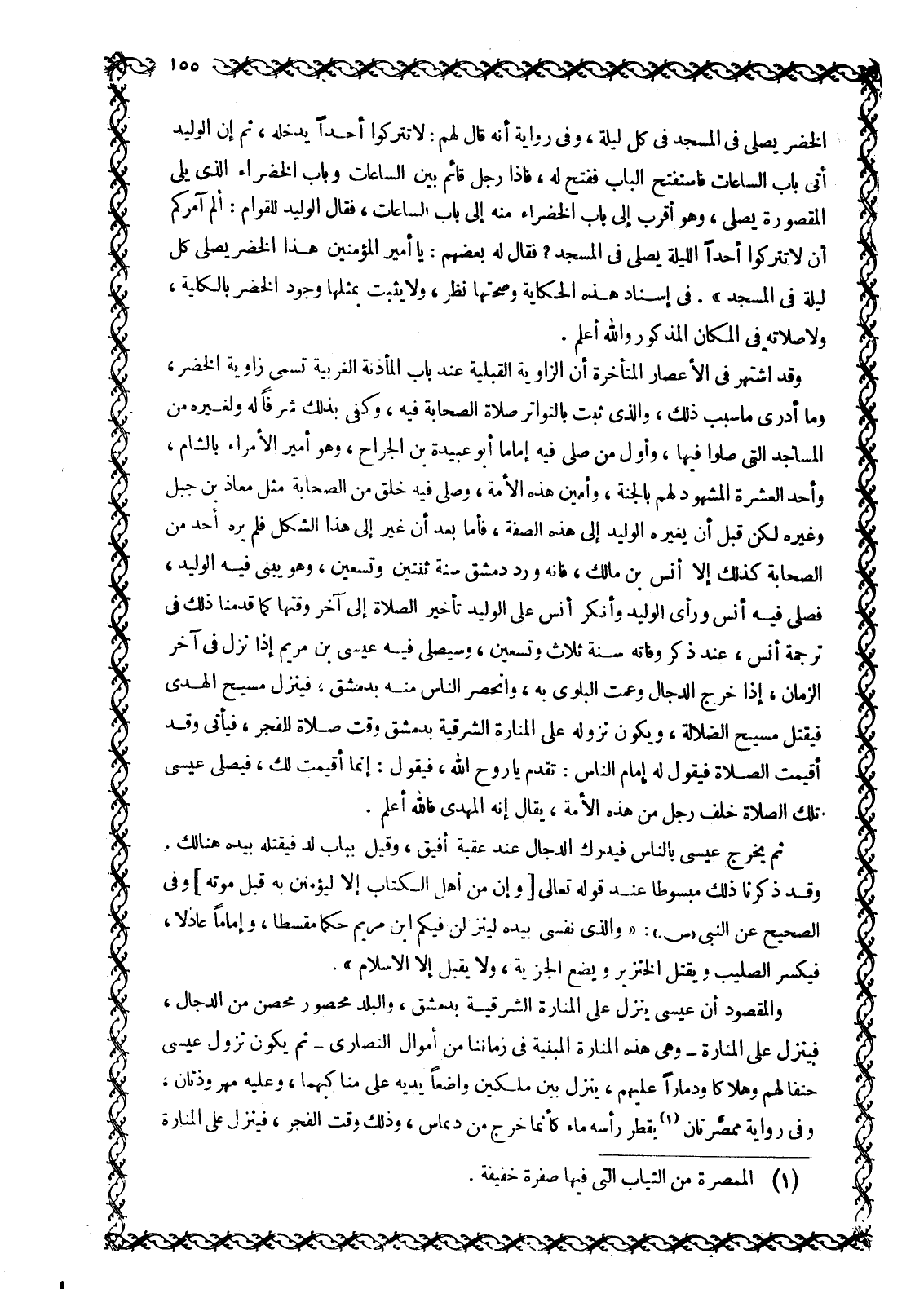 الخضر يصلى في المسجد في كل ليلة، وفي رواية أنه قال لهم: لا تتركوا أحدا يدخله، ثم إن الوليد أَتَى بَابَ السَّاعَاتِ فَاسْتَفْتَحَ الْبَابَ فَفُتِحَ لَهُ، فإذا رجل قائم بين السَّاعَاتِ وَبَابِ الْخَضْرَاءِ الَّذِي يَلِي الْمَقْصُورَةَ يُصَلِّي، وَهُوَ أَقْرَبُ إِلَى بَابِ الْخَضْرَاءِ مِنْهُ إِلَى باب الساعات، فقال الوليد لِلْقُوَّامِ: أَلَمْ آمُرْكُمْ أَنْ لَا تَتْرُكُوا أَحَدًا اللَّيْلَةَ يُصَلِّي فِي الْمَسْجِدِ؟ فَقَالَ لَهُ بَعْضُهُمْ: يا أمير المؤمنين هذا الخضر يُصَلِّي كُلَّ لَيْلَةٍ فِي الْمَسْجِدِ» . فِي إِسْنَادِ هَذِهِ الْحِكَايَةِ وَصِحَّتِهَا نَظَرٌ، وَلَا يَثْبُتُ بِمِثْلِهَا وجود الخضر بالكلية، ولا صلاته في الْمَكَانِ الْمَذْكُورِ وَاللَّهُ أَعْلَمُ.