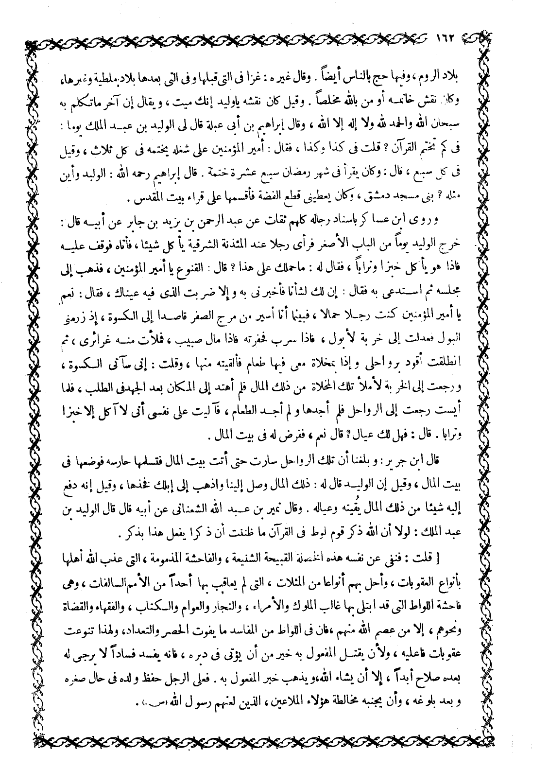 بِلَادَ الرُّومِ، وَفِيهَا حَجَّ بِالنَّاسِ أَيْضًا. وَقَالَ غَيْرُهُ: غَزَا فِي الَّتِي قَبْلَهَا وَفِي الَّتِي بَعْدَهَا بِلَادَ مَلَطْيَةَ وَغَيْرَهَا، وَكَانَ نَقْشُ خَاتَمِهِ أو من باللَّه مُخْلِصًا. وَقِيلَ كَانَ نَقْشُهُ يَا وَلِيدُ إِنَّكَ مَيِّتٌ، وَيُقَالُ إِنَّ آخِرَ مَا تَكَلَّمَ بِهِ سُبْحَانَ اللَّهِ وَالْحَمْدُ للَّه وَلَا إِلَهَ إِلَّا اللَّهُ، وَقَالَ إِبْرَاهِيمُ بْنُ أَبِي عَبْلَةَ قَالَ لِي الْوَلِيدُ بْنُ عَبْدِ الْمَلِكِ يَوْمًا: