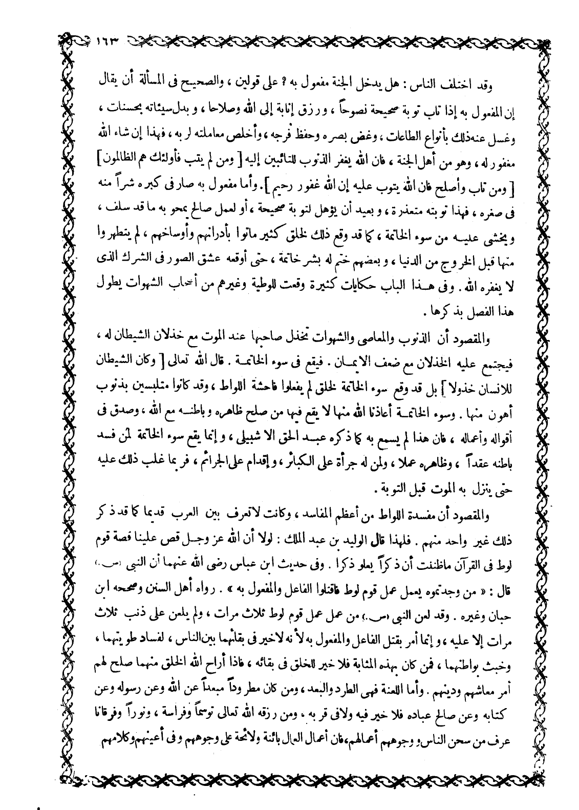 والمقصود أن الذنوب والمعاصي والشهوات تخذل صاحبها عند الموت مع خذلان الشيطان له، فيجتمع عليه الخذلان مع ضعف الايمان. فيقع في سوء الخاتمة. قال الله تعالى وَكانَ الشَّيْطانُ لِلْإِنْسانِ خَذُولًا 25: 29 بل قد وقع سوء الخاتمة لخلق لم يفعلوا فاحشة اللواط، وقد كانوا متلبسين بذنوب أهون منها. وسوء الخاتمة أعاذنا الله منها لا يقع فيها من صلح ظاهره وباطنه مع الله، وصدق في أقواله، وأعماله، فان هذا لم يسمع به كما ذكره عبد الحق الإشبيلي، وإنما يقع سوء الخاتمة لمن فسد باطنه عقدا، وظاهره عملا، ولمن له جرأة على الكبائر، وإقدام على الجرائم، فربما غلب ذلك عليه حتى ينزل به الموت قبل التوبة.