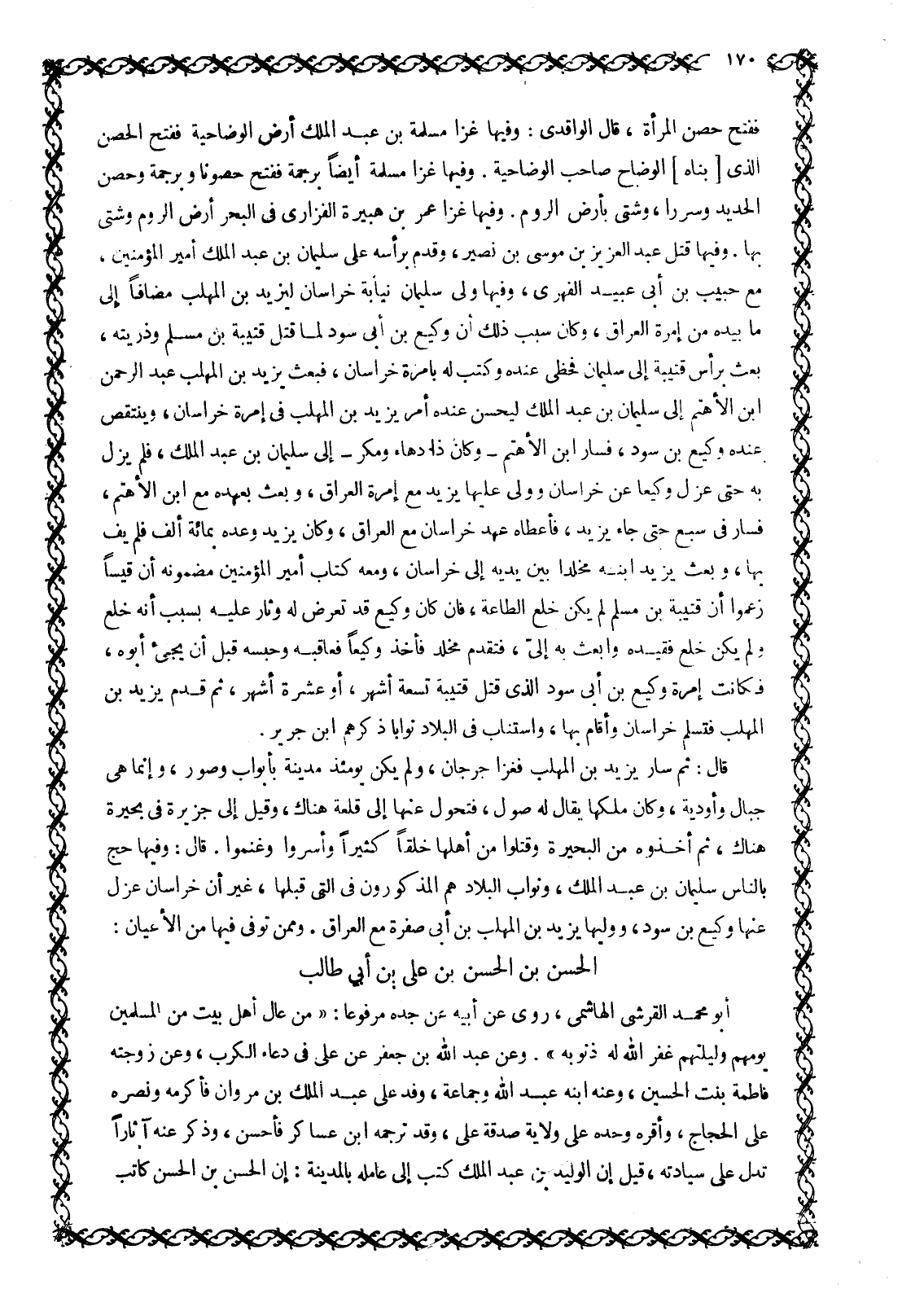 فَفَتَحَ حِصْنَ الْمَرْأَةِ، قَالَ الْوَاقِدِيُّ: وَفِيهَا غَزَا مسلمة بن عبد الملك أرض الوضاحية ففتح الحصن الّذي [بناه] الْوَضَّاحُ صَاحِبُ الْوَضَّاحِيَّةِ. وَفِيهَا غَزَا مَسْلَمَةُ أَيْضًا برجمة ففتح حصونا وبرجمة وحصن الحديد وسررا، وَشَتَّى بِأَرْضِ الرُّومِ. وَفِيهَا غَزَا عُمَرُ بْنُ هُبَيْرَةَ الْفَزَارِيُّ فِي الْبَحْرِ أَرْضَ الرُّومِ وَشَتَّى بِهَا. وَفِيهَا قُتِلَ عَبْدُ الْعَزِيزِ بْنُ مُوسَى بْنِ نُصَيْرٍ، وَقَدِمَ بِرَأْسِهِ عَلَى سُلَيْمَانَ بْنِ عبد الملك أمير المؤمنين، مع حَبِيبُ بْنُ أَبِي عُبَيْدٍ الْفِهْرِيُّ، وَفِيهَا وَلَّى سُلَيْمَانُ نِيَابَةَ خُرَاسَانَ لِيَزِيدَ بْنِ الْمُهَلَّبِ مُضَافًا إِلَى مَا بِيَدِهِ مِنْ إِمْرَةِ الْعِرَاقِ، وَكَانَ سَبَبُ ذَلِكَ أَنَّ وَكِيعَ بْنَ أَبِي سُودٍ لَمَّا قُتِلَ قُتَيْبَةُ بْنُ مُسْلِمٍ وَذُرِّيَّتُهُ، بَعَثَ بِرَأْسِ قُتَيْبَةَ إِلَى سُلَيْمَانَ فَحَظِيَ عِنْدَهُ وَكَتَبَ لَهُ بِإِمْرَةِ خُرَاسَانَ، فَبَعَثَ يَزِيدُ بْنُ الْمُهَلَّبِ عبد الرحمن ابن الْأَهْتَمِ إِلَى سُلَيْمَانَ بْنِ عَبْدِ الْمَلِكِ لِيُحَسِّنَ عِنْدَهُ أَمْرَ يَزِيدَ بْنِ الْمُهَلَّبِ فِي إِمْرَةِ خراسان، وينتقص عنده وكيع بن سُودٍ، فَسَارَ ابْنُ الْأَهْتَمِ- وَكَانَ ذَا دَهَاءٍ وَمَكْرٍ- إِلَى سُلَيْمَانَ بْنِ عَبْدِ الْمَلِكِ، فَلَمْ يَزَلْ بِهِ حَتَّى عَزَلَ وَكِيعًا عَنْ خُرَاسَانَ وَوَلَّى عَلَيْهَا يَزِيدَ مَعَ إِمْرَةِ الْعِرَاقِ، وَبَعَثَ بِعَهْدِهِ مَعَ ابْنِ الْأَهْتَمِ، فَسَارَ فِي سَبْعٍ حَتَّى جَاءَ يَزِيدَ، فَأَعْطَاهُ عَهْدَ خُرَاسَانَ مَعَ الْعِرَاقِ، وَكَانَ يَزِيدُ وَعَدَهُ بِمِائَةِ أَلْفٍ فَلَمْ يف بِهَا، وَبَعَثَ يَزِيدُ ابْنَهُ مَخْلَدًا بَيْنَ يَدَيْهِ إِلَى خُرَاسَانَ، وَمَعَهُ كِتَابُ أَمِيرِ الْمُؤْمِنِينَ مَضْمُونُهُ أَنَّ قَيْسًا زَعَمُوا أَنَّ قُتَيْبَةَ بْنَ مُسْلِمٍ لَمْ يَكُنْ خَلَعَ الطَّاعَةَ، فَإِنْ كَانَ وَكِيعٌ قَدْ تَعَرَّضَ لَهُ وَثَارَ عَلَيْهِ بِسَبَبِ أَنَّهُ خَلَعَ وَلَمْ يَكُنْ خَلَعَ فَقَيِّدْهُ وَابْعَثْ بِهِ إِلَيَّ، فَتَقَدَّمَ مَخْلَدٌ فَأَخَذَ وَكِيعًا فَعَاقَبَهُ وَحَبَسَهُ قَبْلَ أَنْ يَجِيءَ أَبُوهُ، فَكَانَتْ إِمْرَةُ وَكِيعِ بن أبى سود الّذي قتل قتيبة تِسْعَةَ أَشْهُرٍ، أَوْ عَشْرَةَ أَشْهُرٍ، ثُمَّ قَدِمَ يَزِيدُ بْنُ الْمُهَلَّبِ فَتَسَلَّمَ خُرَاسَانَ وَأَقَامَ بِهَا، وَاسْتَنَابَ فِي الْبِلَادِ نُوَّابًا ذَكَرَهُمُ ابْنُ جَرِيرٍ.